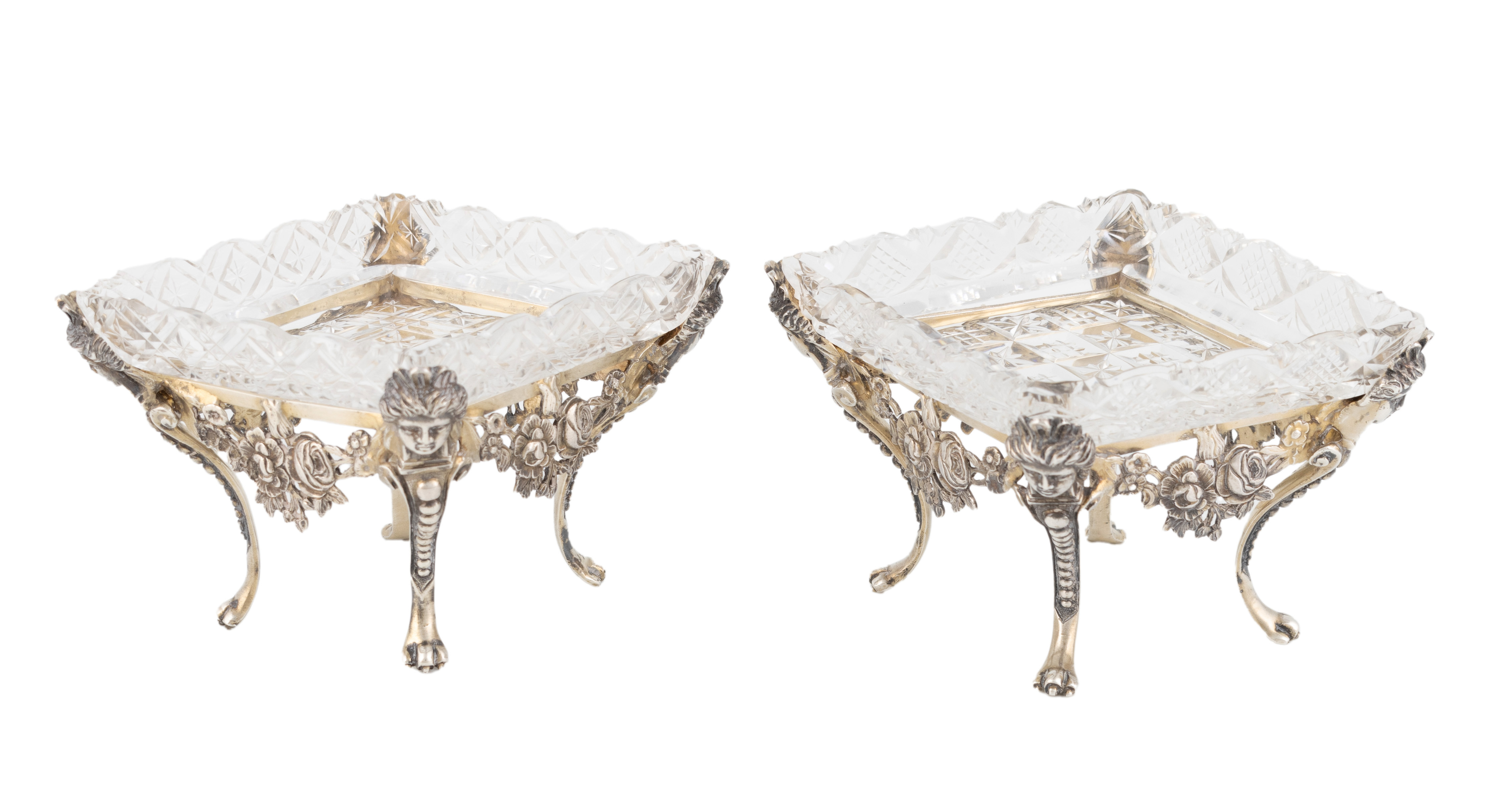 triangular form, pierced and cast with rose garlands, on four mask capped beaded scroll legs, with two similar cut glass dishes, length 12.4cm, approx. weight 6oz. (2)