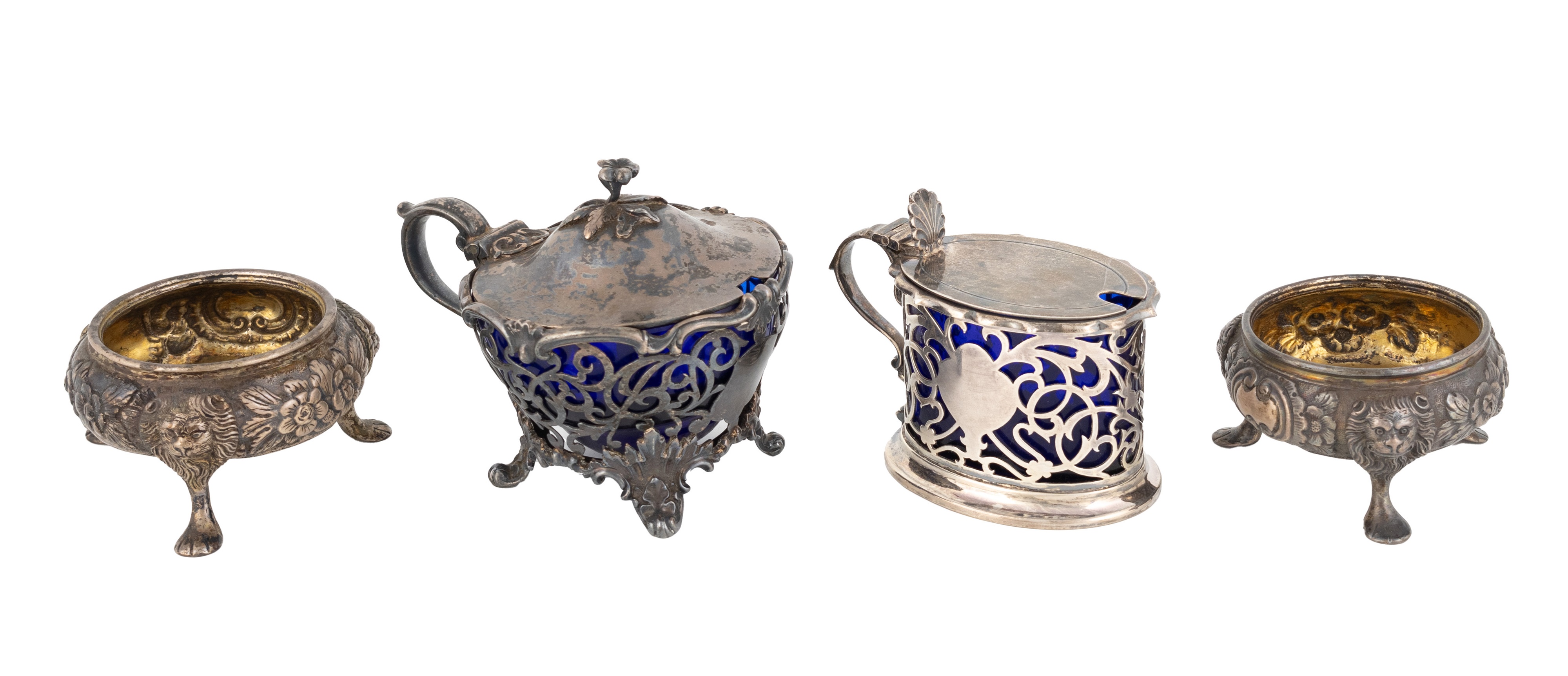 circular form with pierced scroll decoration, a hinged cover with a flower finial, on four scroll and foliate bracket feet, diameter 8cm, plus a silver mustard pot by Atkin Brothers, Sheffield 1912, and a pair of mid-18th century Irish silver salt cellars, maker's marks worn, total approx. weight 15.4oz. (4)
