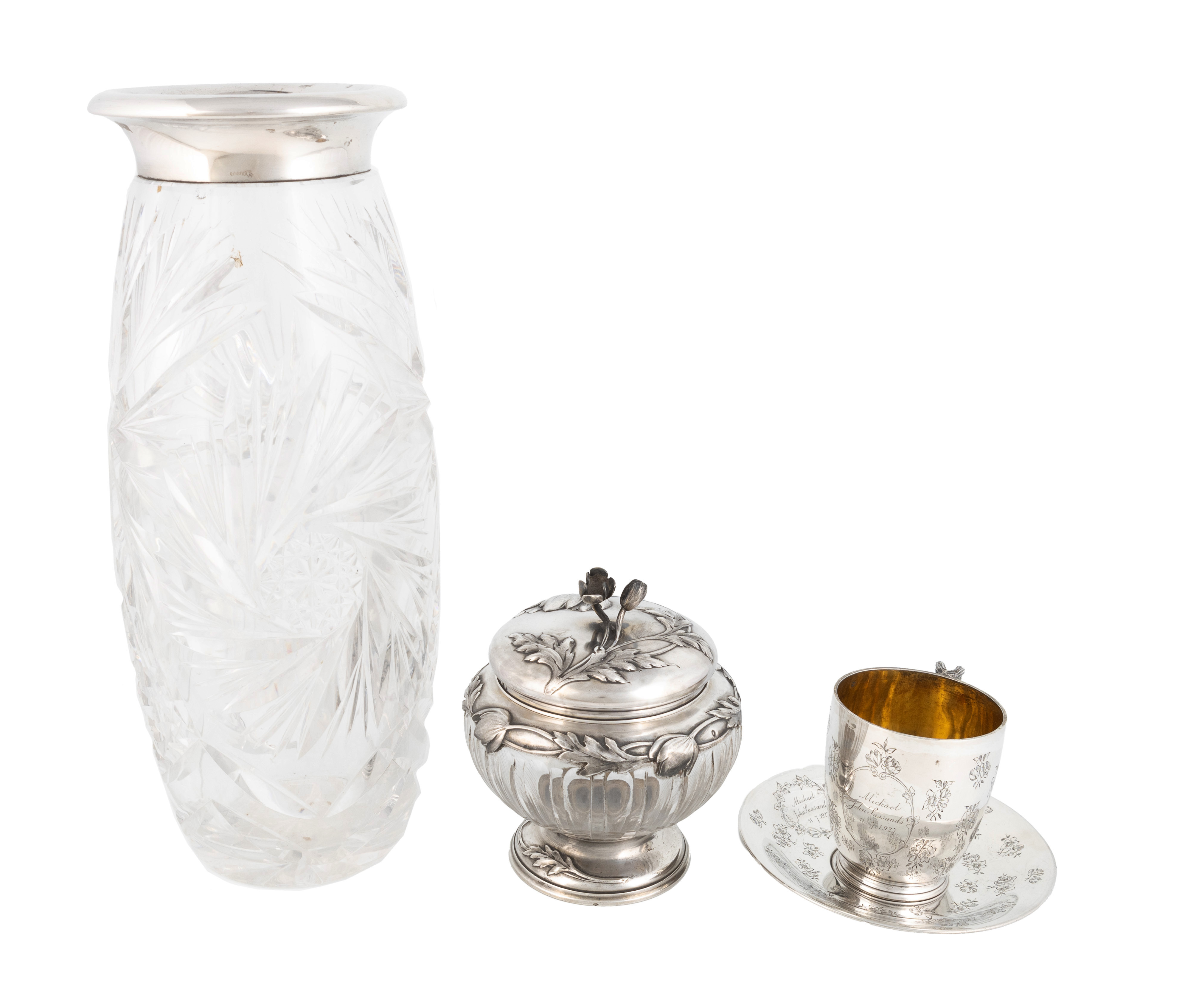 circular form with a fluted glass body, embossed foliate decoration the cover with a two-bud finial, plus a French silver cup and saucer possibly by Charles Tribour, Paris circa 1927, and a German silver-mounted cut glass vase, height 34cm, total approx. weighable 11.1oz. (4)