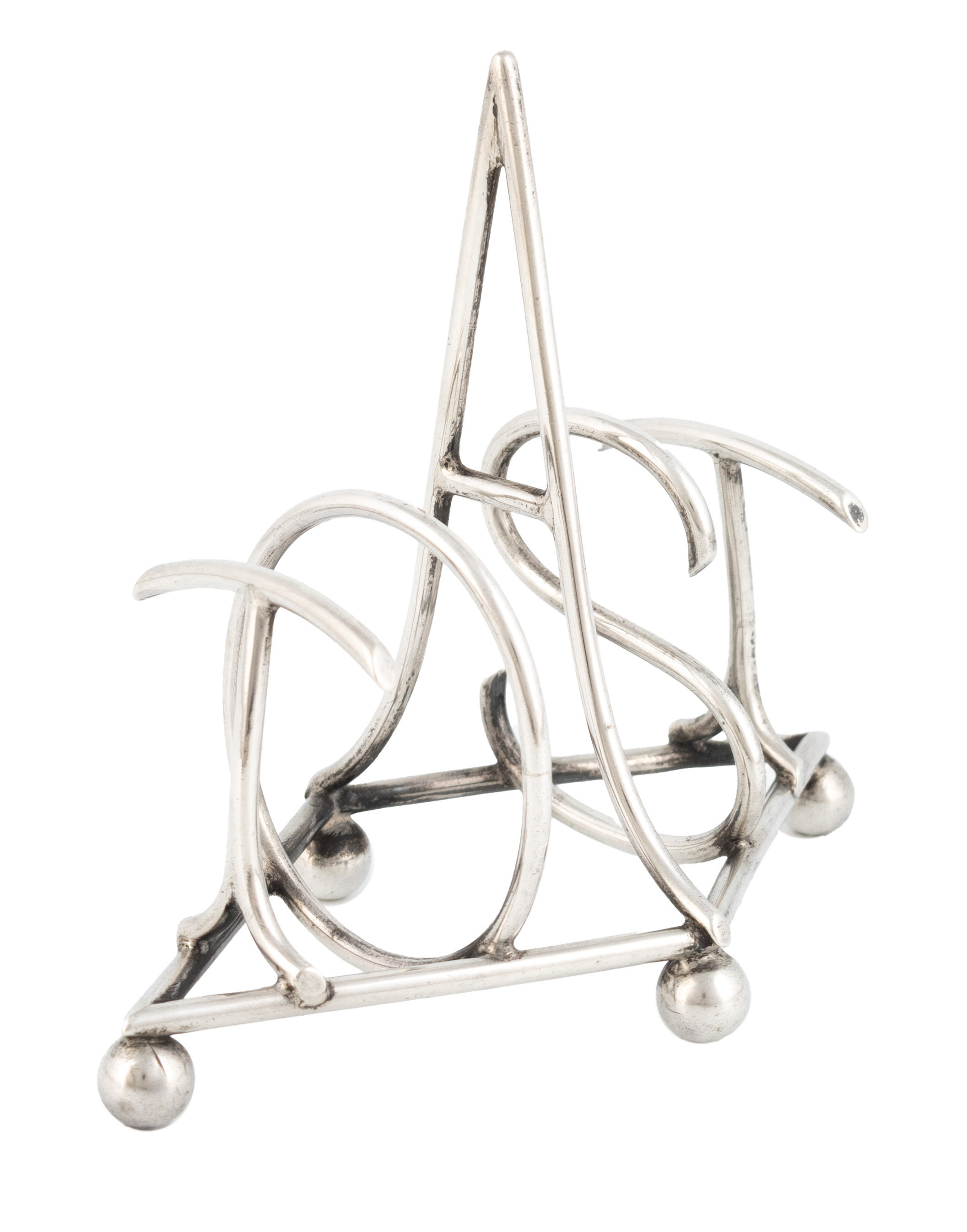 the bars modelled as the letters of toast, on a lozenge base on four ball feet, length 12.3cm, approx. weight 3.1oz.
