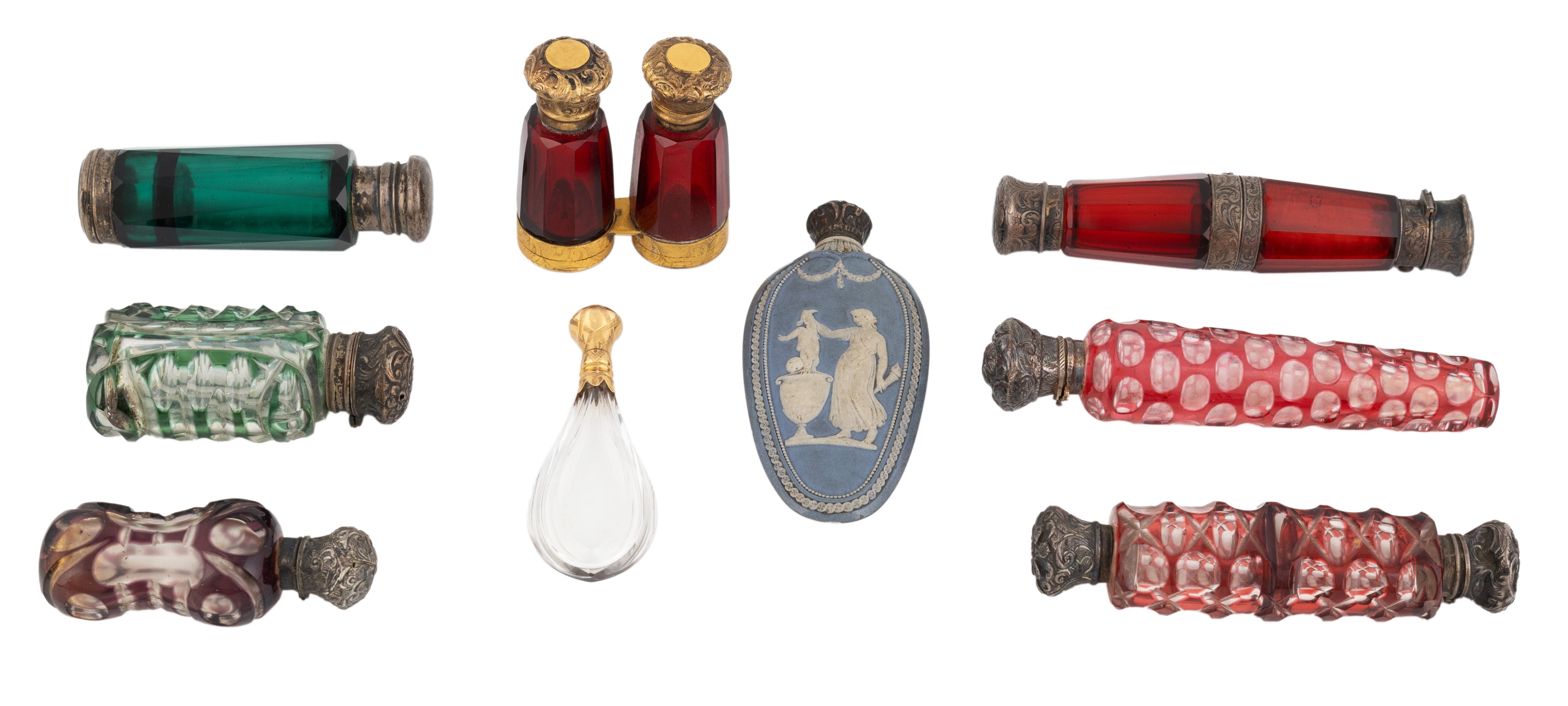 A collection of 19th century silver-mounted and gilt metal mounted glass scent bottles,