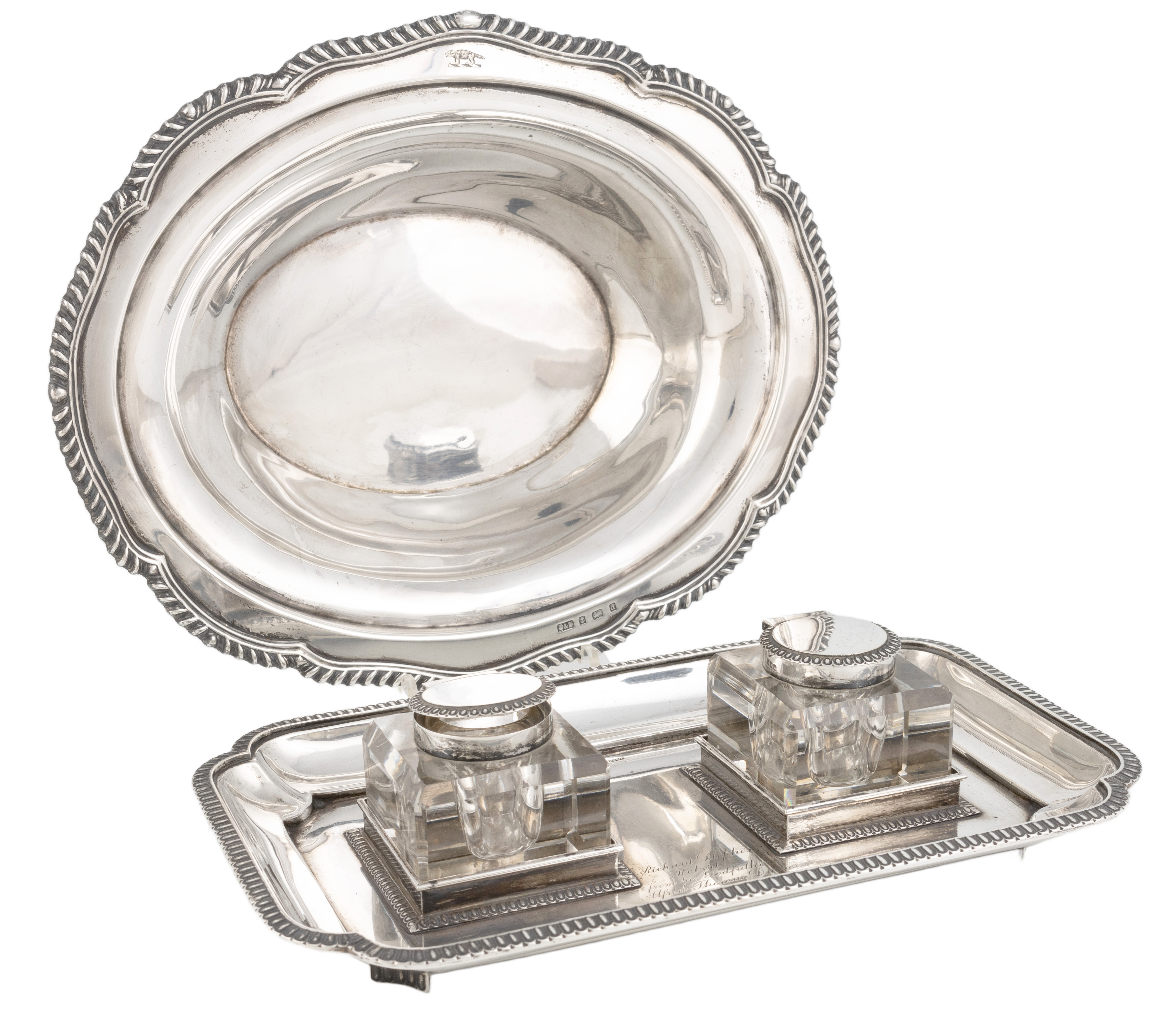 shaped-rectangular form with a moulded border, with two silver-mounted glass inkwells, on four bracket feet, plus an Edwardian silver dish by Deykin & Harrison, Birmingham 1903, length 27.4cm, total approx. weight 32.3oz. (2)