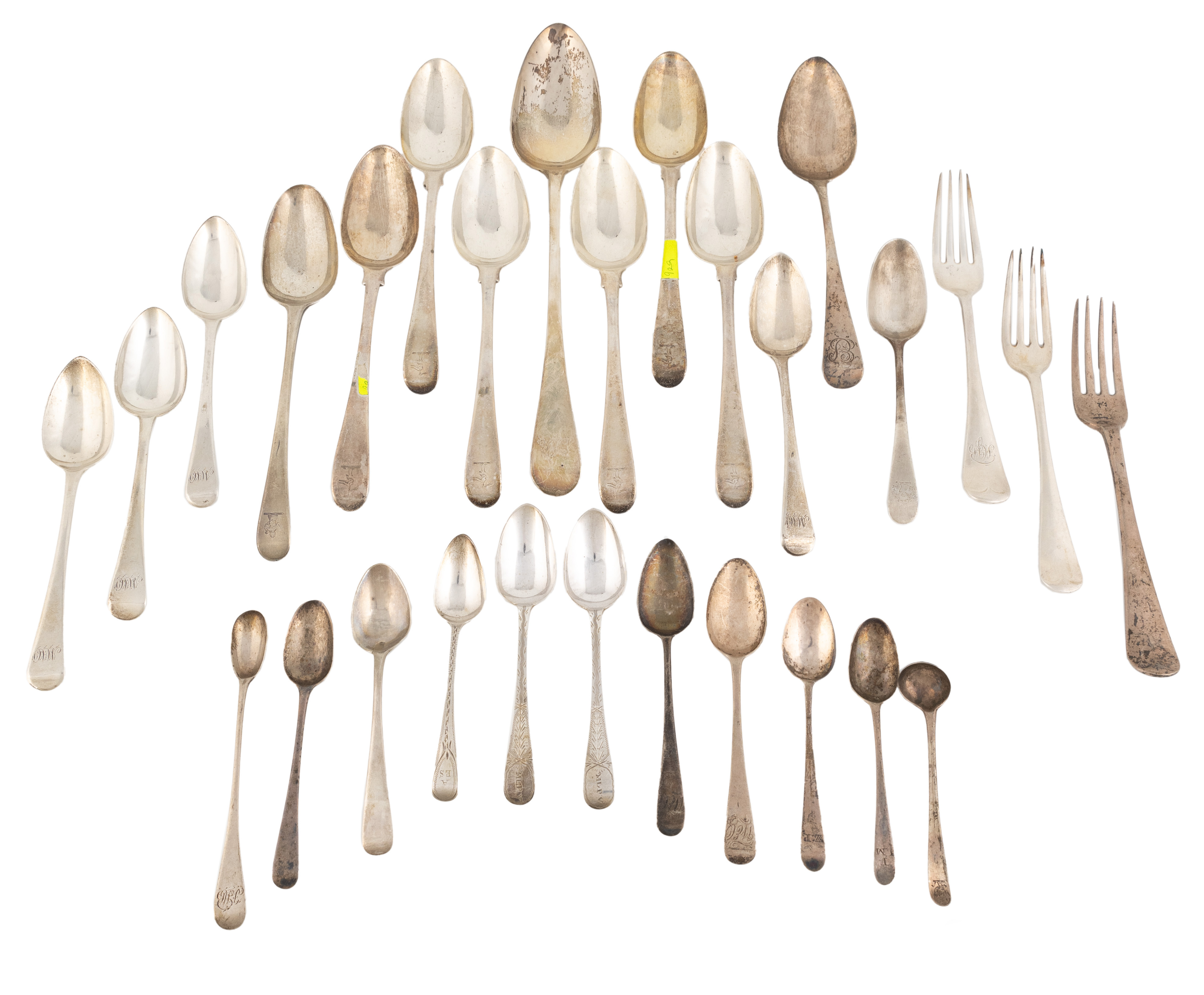 comprising: a set of six tablespoons by Thomas Chawner 1772, a basting spoon, two tablespoons, five dessert spoons, three table forks, nine teaspoons, a mustard spoon and a condiment spoon, total approx. weight 37.3oz. (28)