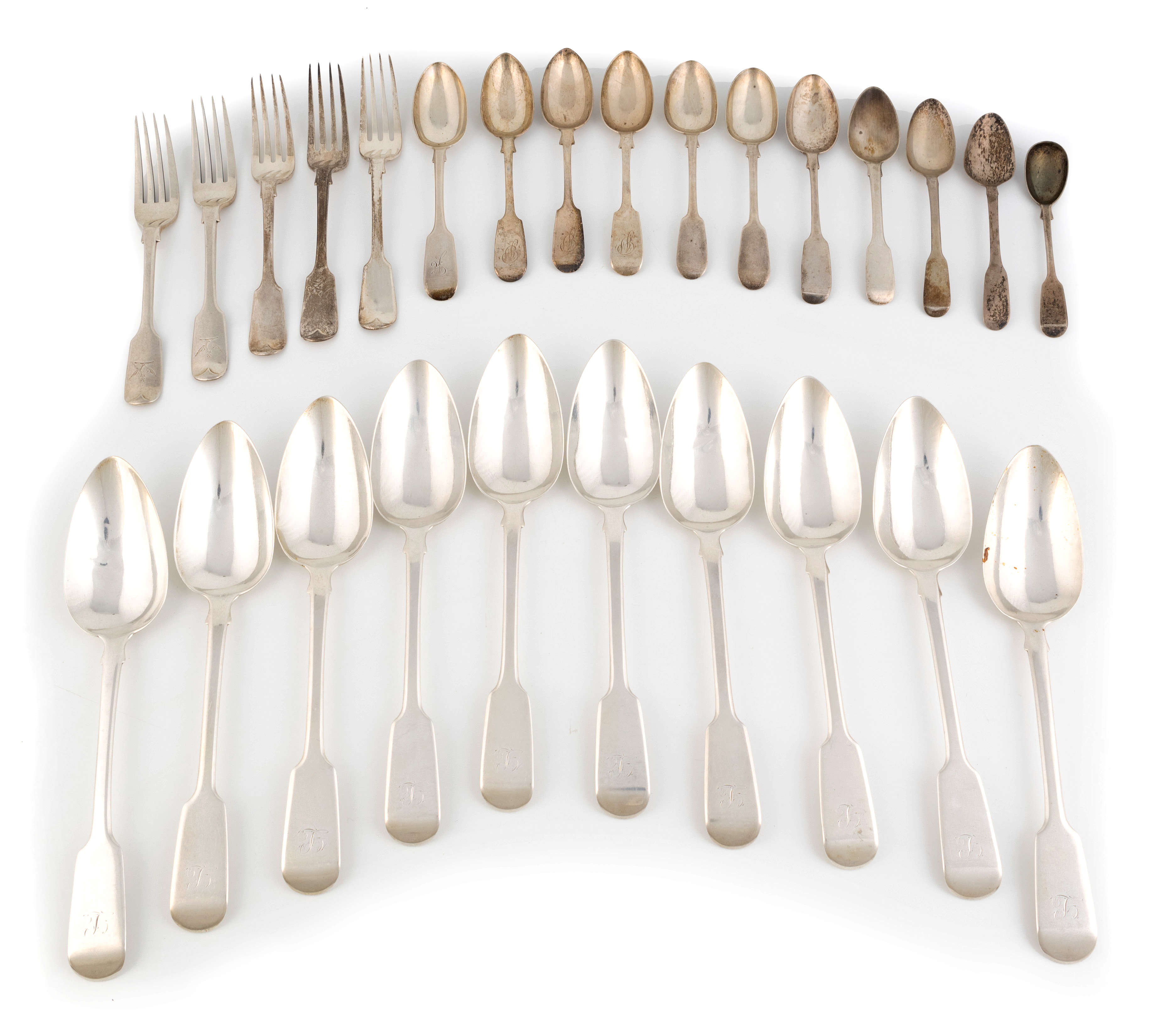 comprising: a set of ten tablespoons by George Turner, Exeter 1822, five dessert forks, ten teaspoons and a mustard spoon, total approx. weight 34.5oz. (26)