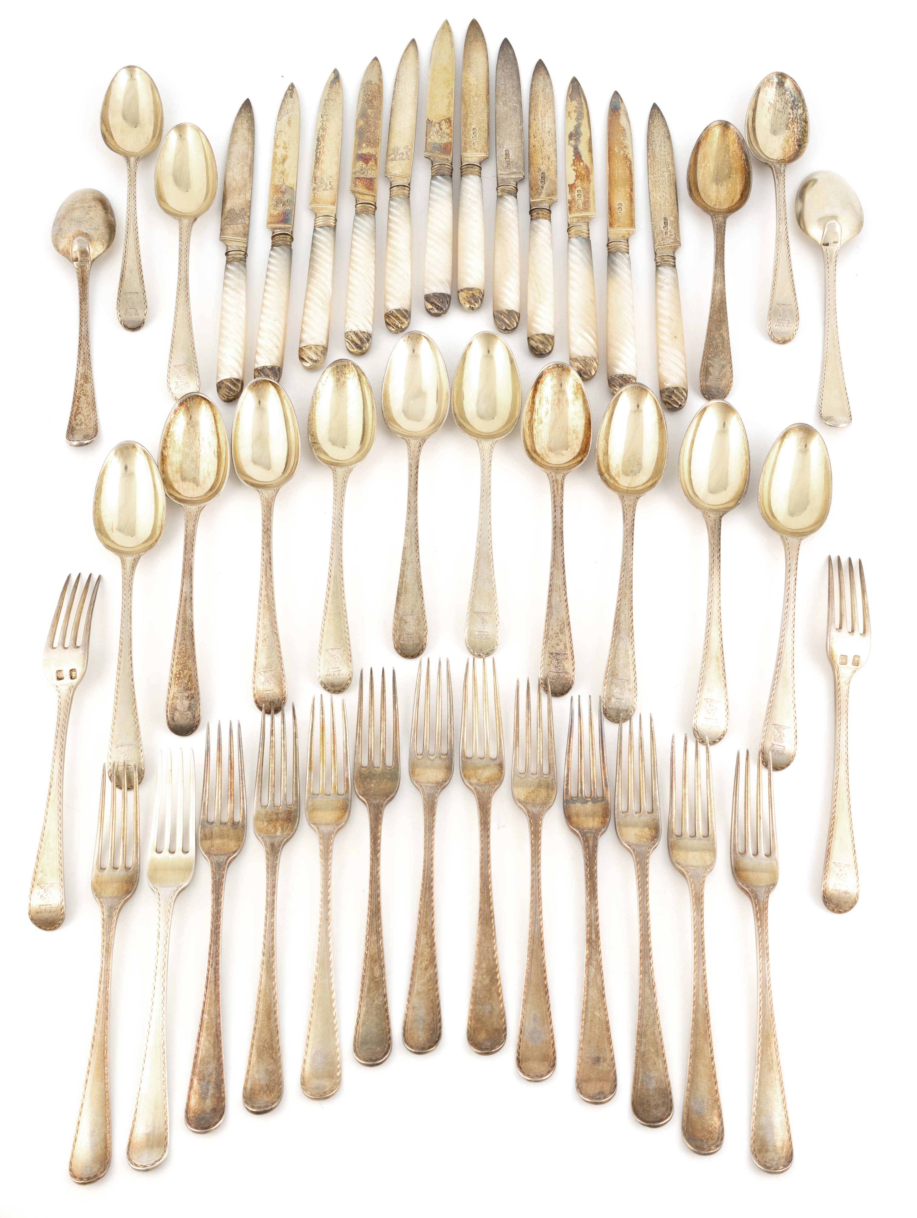 comprising: sixteen dessert spoons and fifteen dessert forks, all with engraved crowned crests, plus a set of twelve mother-of-pearl handled silver-gilt dessert knives by Moses Brent, London 1802, total approx. weighable 42oz. (43)