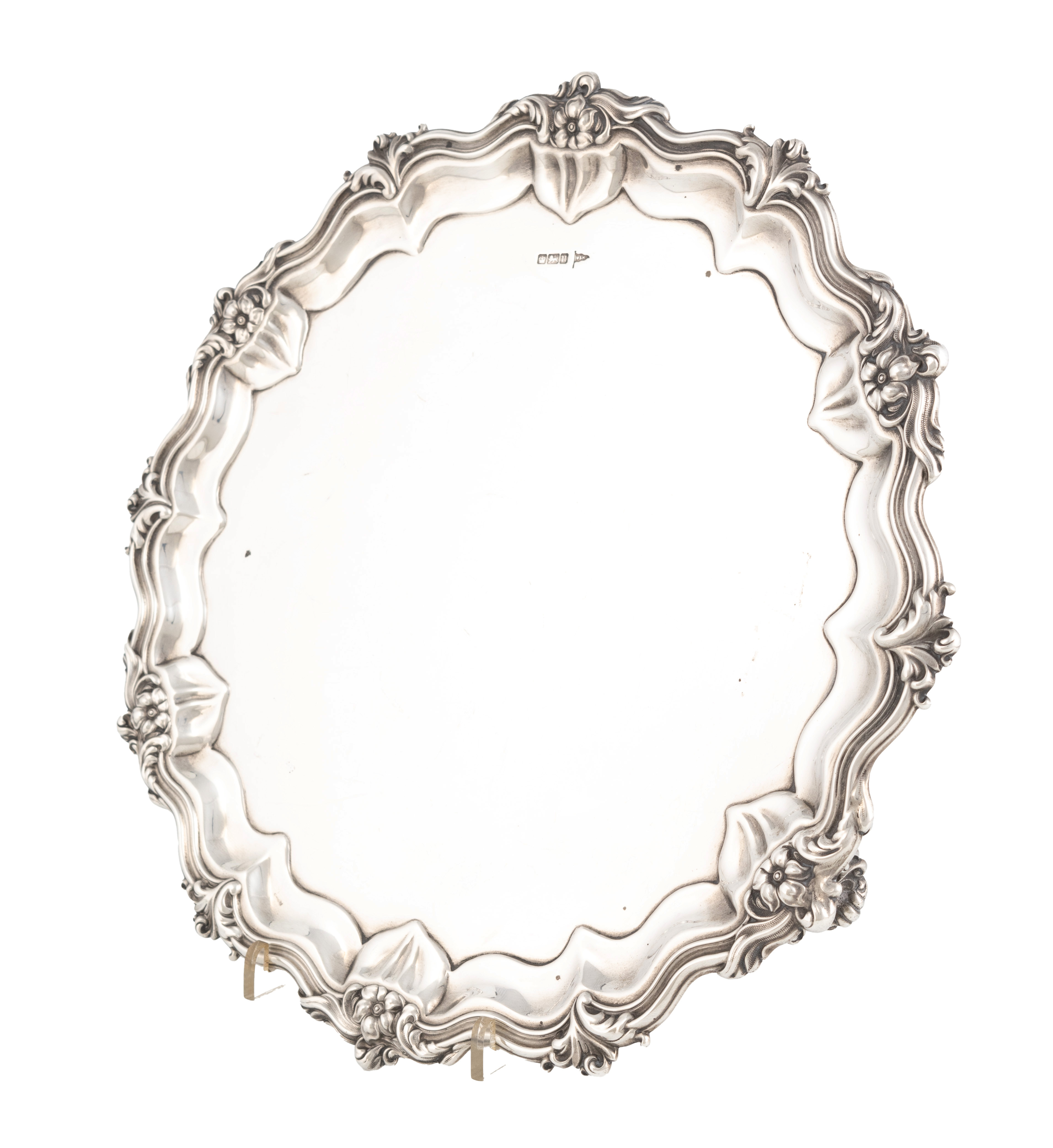 shaped circular form with a scroll and foliate moulded border, on three scroll bracket feet, diameter 32.3cm, approx. weight 27.3oz.