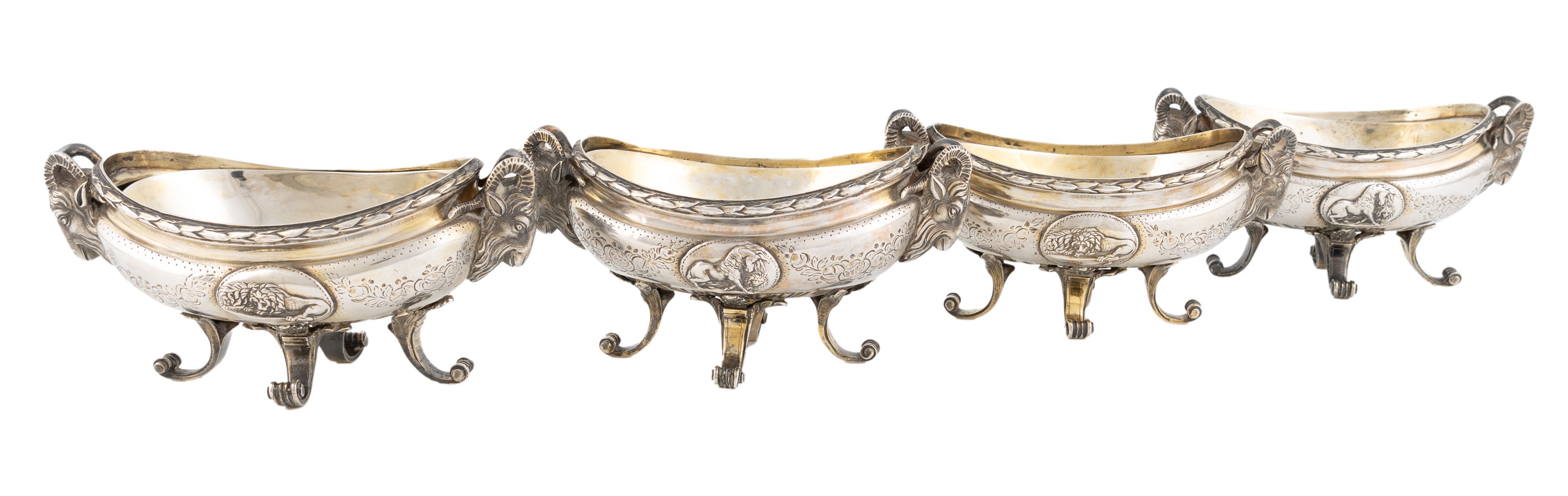navette form, the sides applied with rams' masks, engraved with floral garlands, applied oval vignettes to the sides, one of a horse and lion and the other of two recumbent lions, on four acanthus leaf-capped scroll feet, with unmarked gilt liners, length 14.2cm, total approx. weighable 29.8oz. (4)