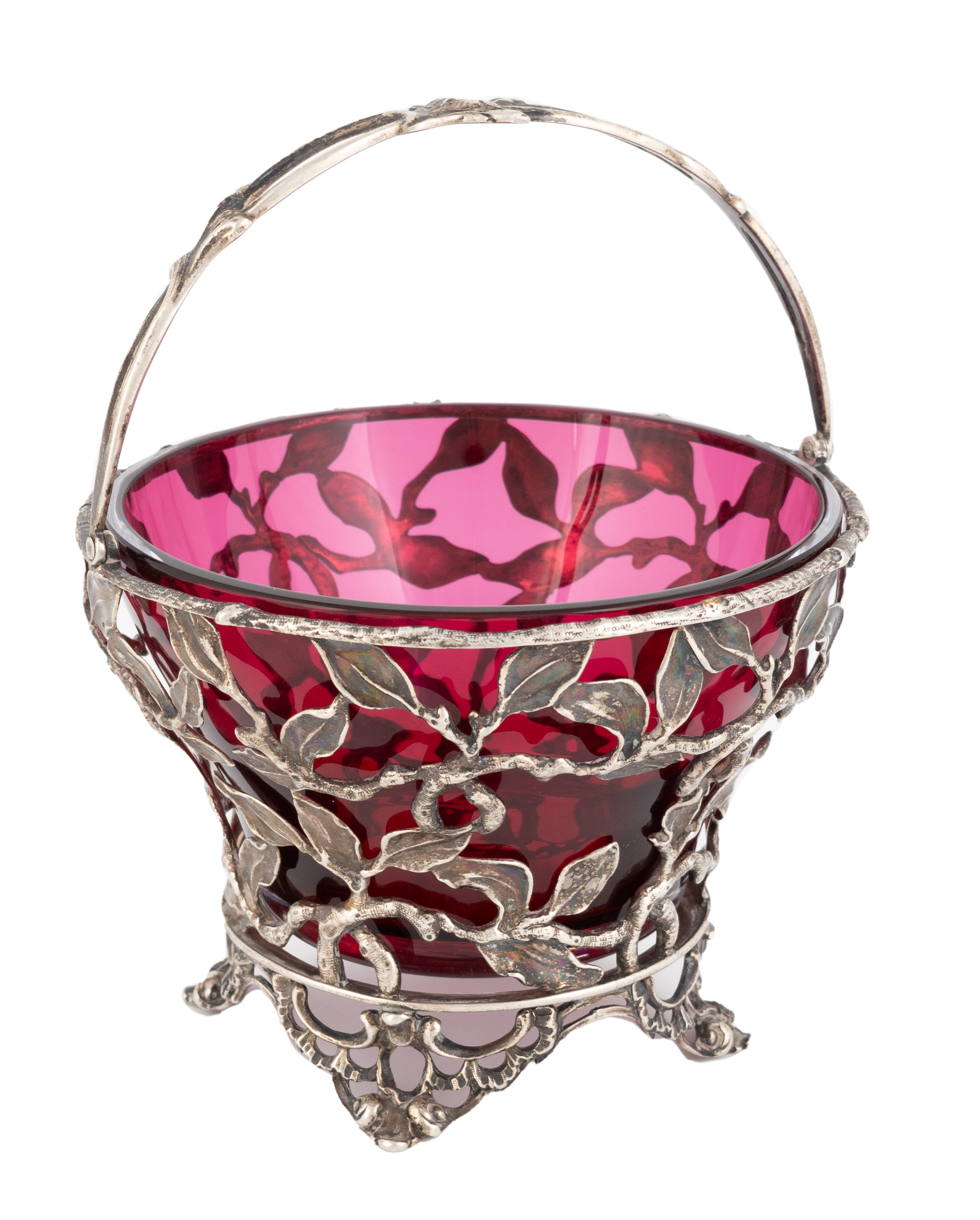 circular form with pierced foliate decoration, pierced swing-handle, on four pierced foliate bracket feet, with a pink glass liner, diameter 12.6cm, approx. weight 7oz.