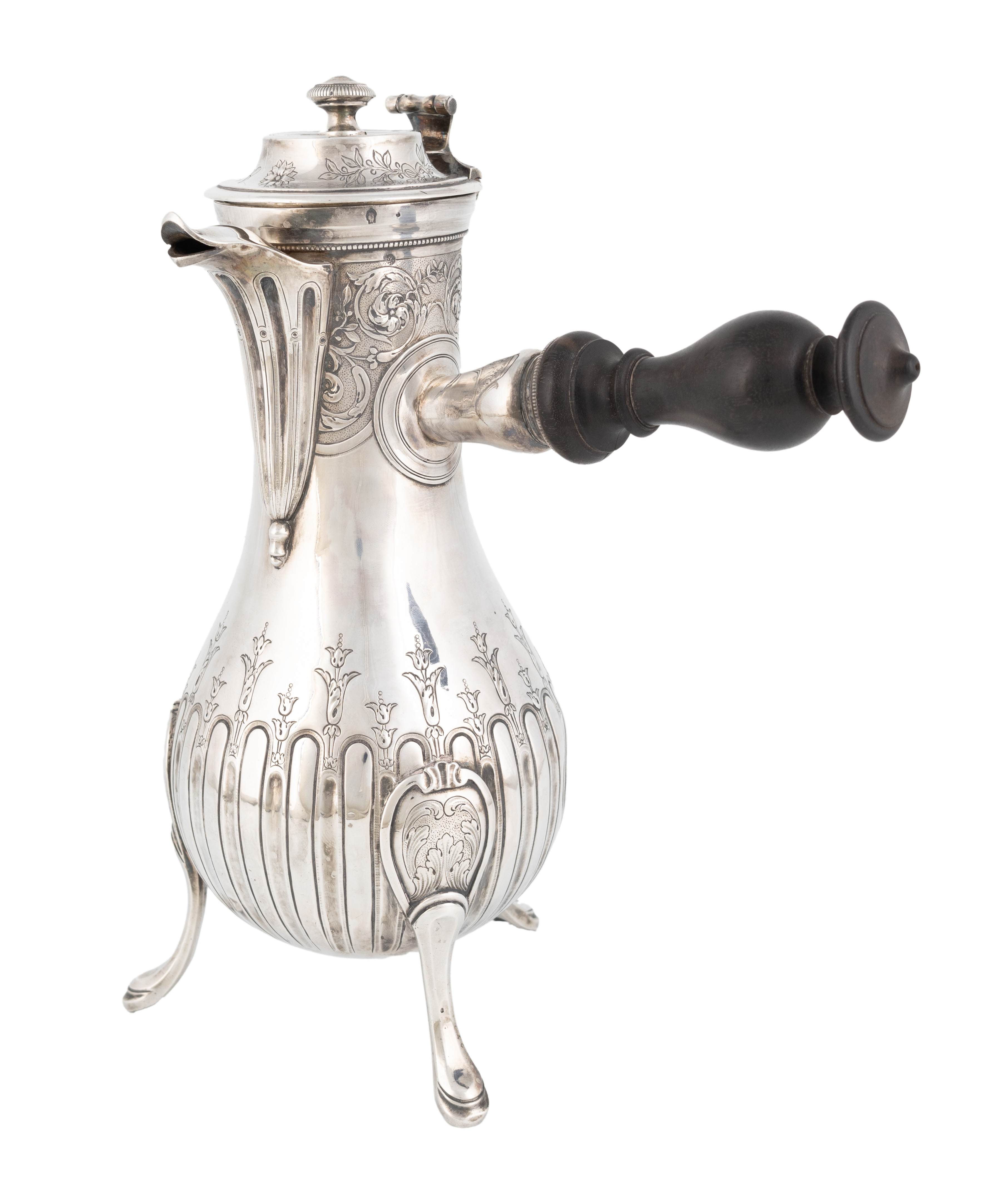 baluster form, with part-fluted and foliate decoration, turned wooden side handle, on three scroll legs, height 26.1cm, approx. weight 24.6oz.