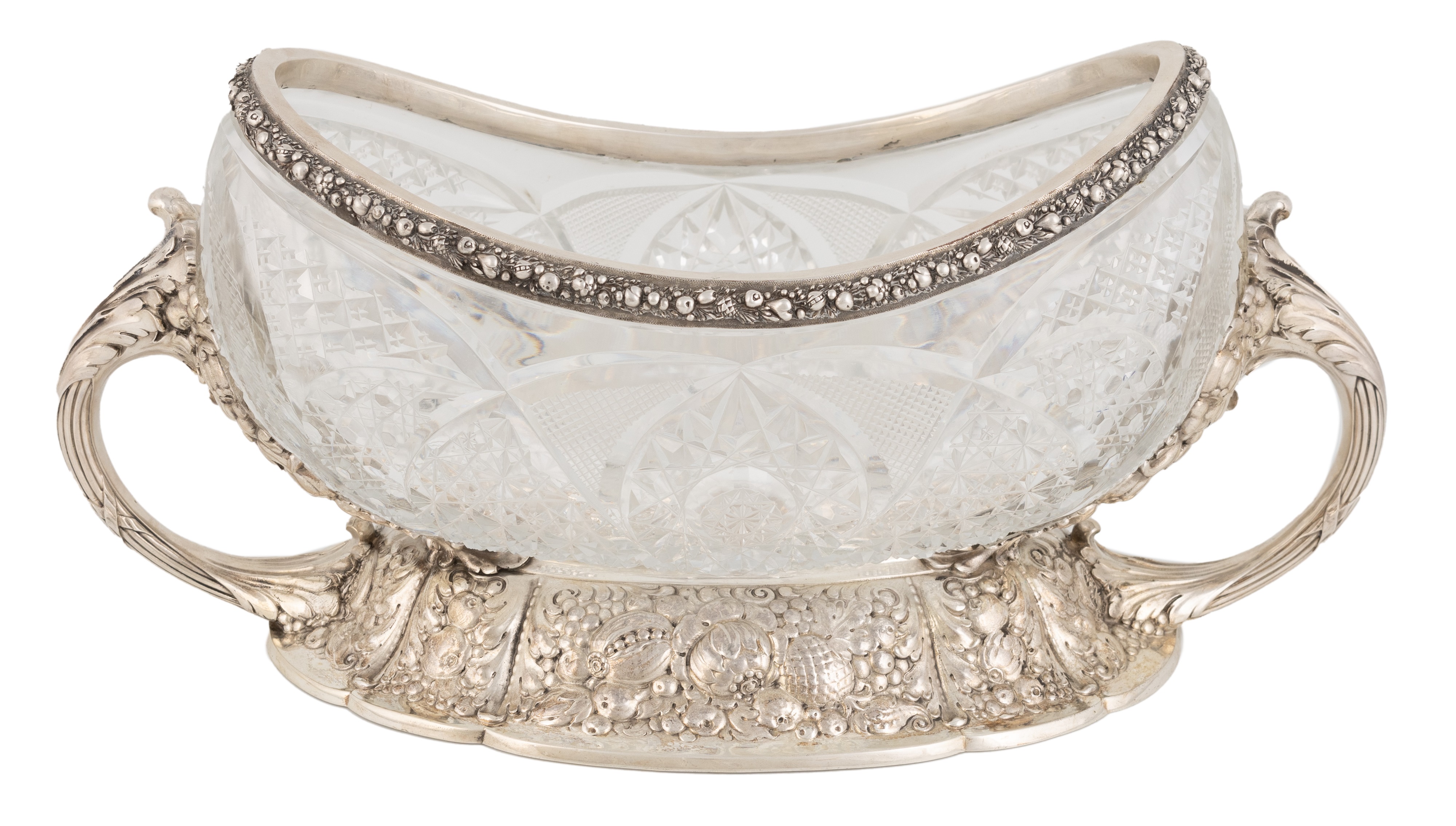 oval form with embossed scroll and foliate decoration, two scroll handles with acanthus leaf decoration with swags of foliate decoration, the cut glass bowl with a silver-mounted foliate border, length 41.3cm, approx. weighable 30.1oz.