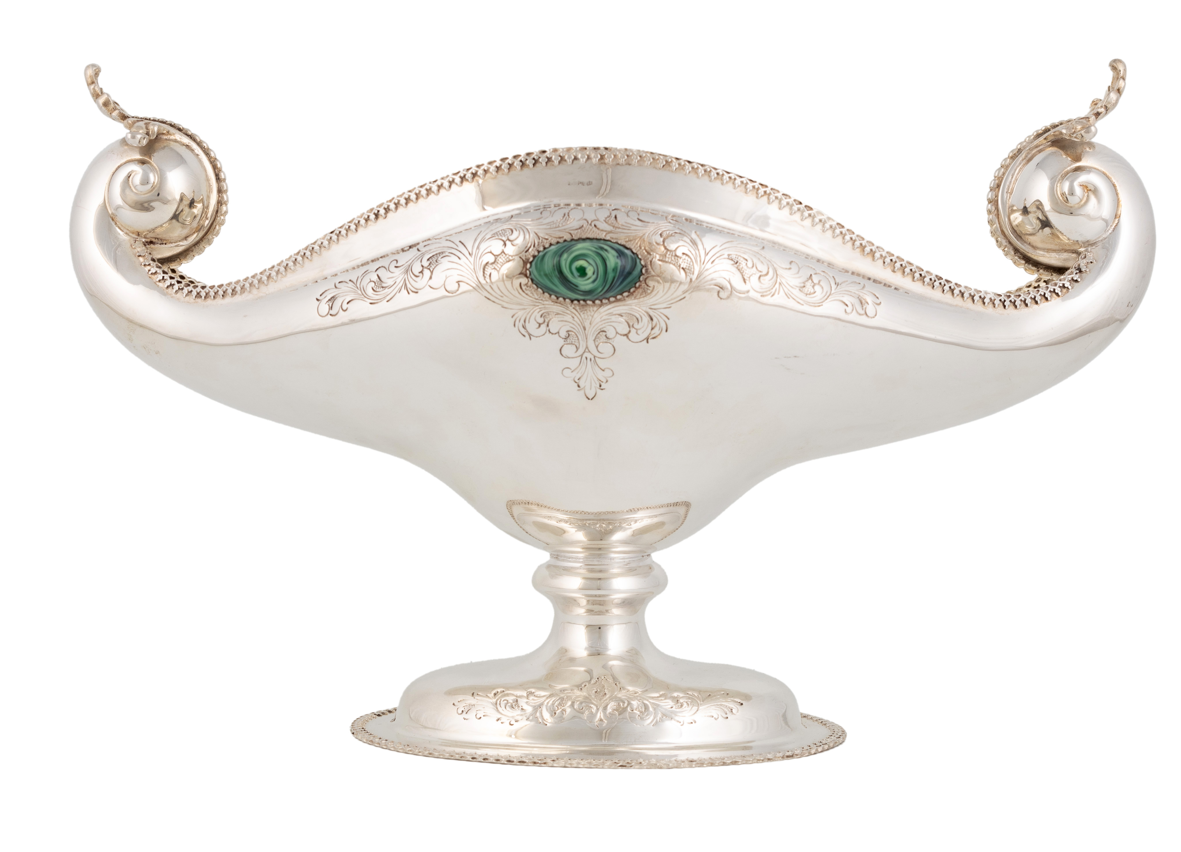 oval form with scroll and acanthus leaf sides, engraved and embossed scroll foliate decoration, set with malachite cabochons, on a raised oval foot, length 35cm, approx. weight 31.9oz.