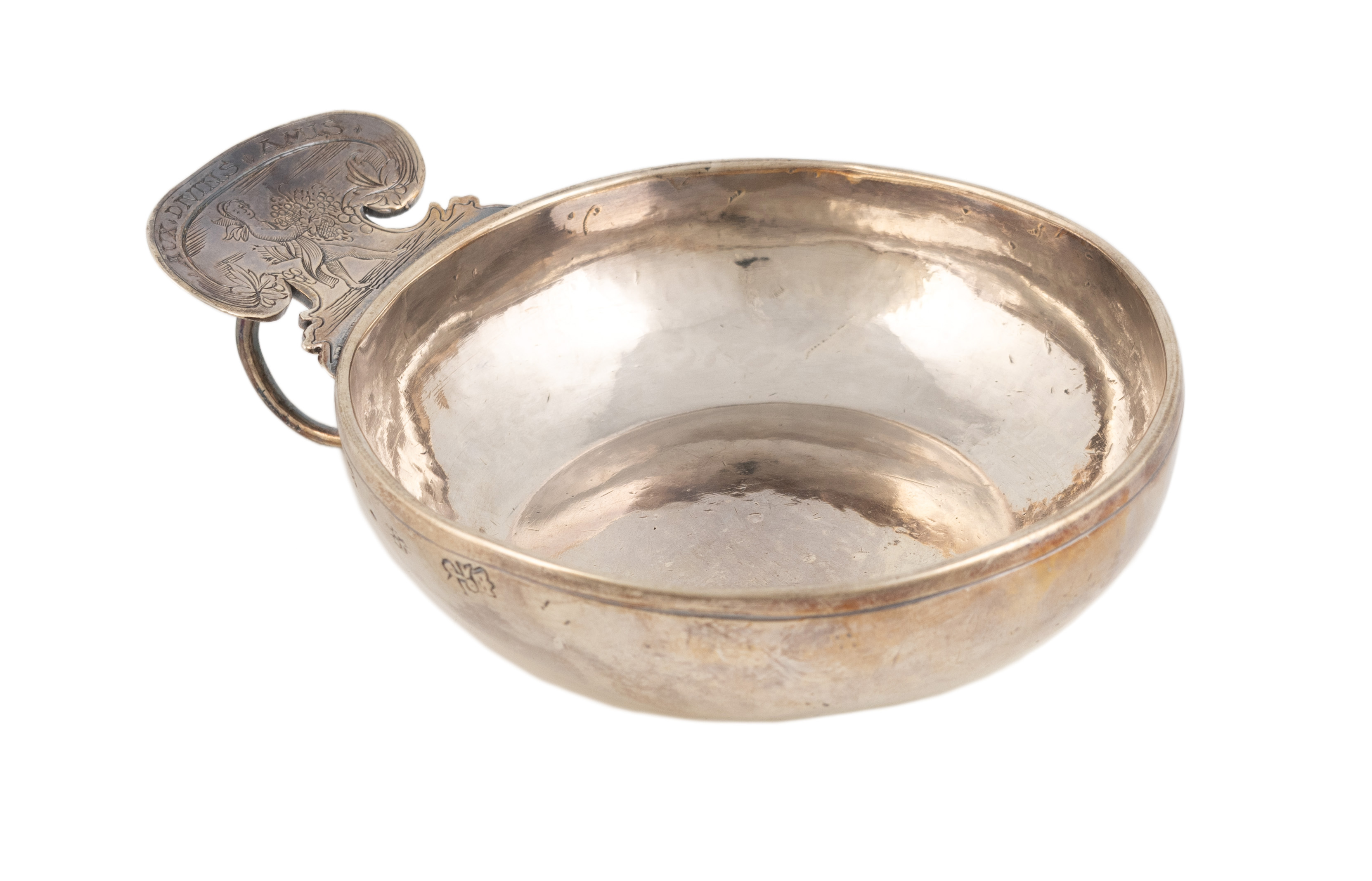 circular form, the shaped scroll thumb-piece engraved with a cherub holding a bunch of grapes, also inscribed 'Aux Divins Amis', with a finger ring, length 11.2cm, approx. weight 4.3oz.