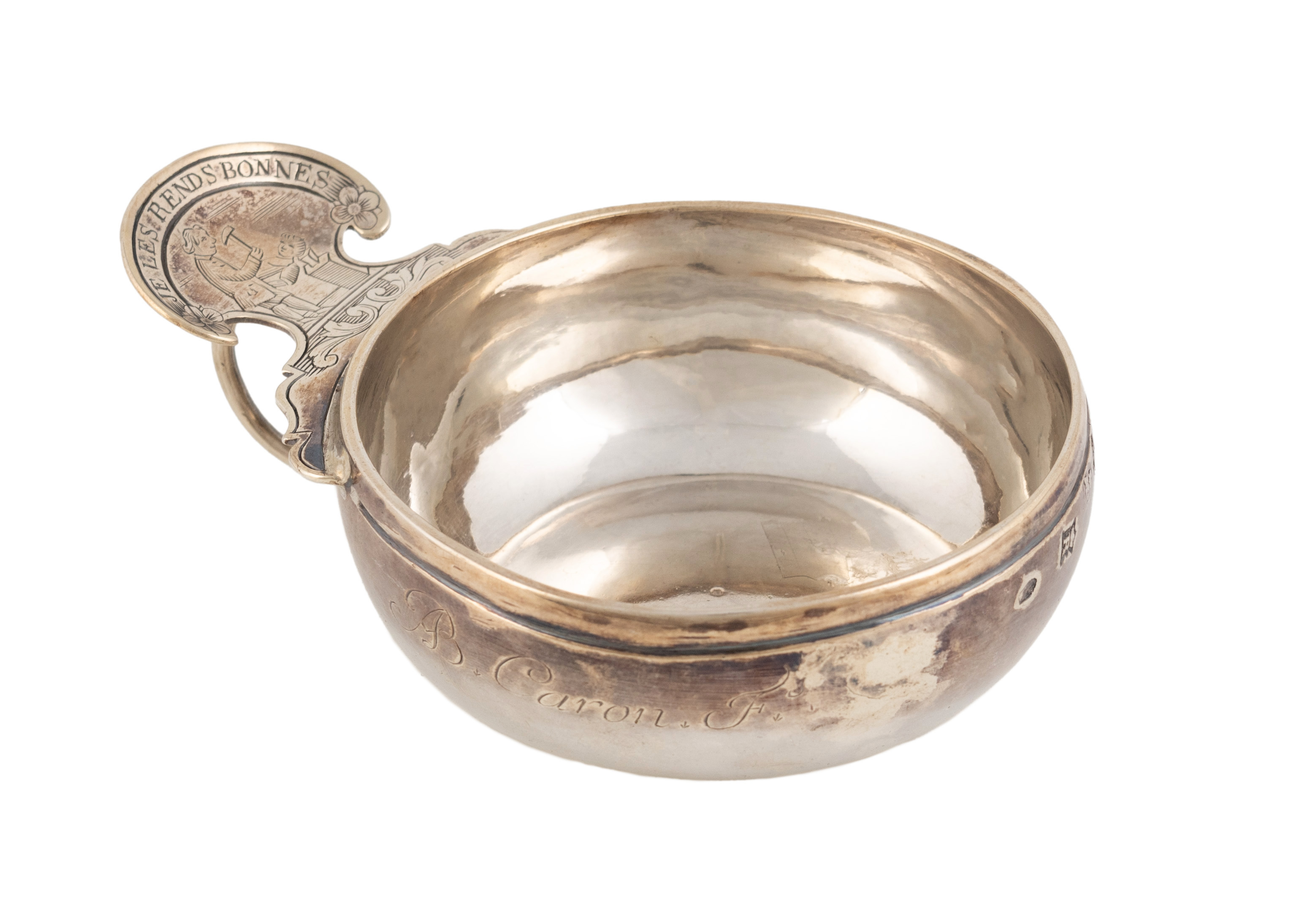 circular form, the shaped scroll thumb-piece engraved with a man holding a hammer over a laying woman, her head on a support, also inscribed 'Je Les Rends Bonnes', with a finger ring, the side inscribed 'B. Caron Fs', length 11.2cm, approx. weight 3.4oz.