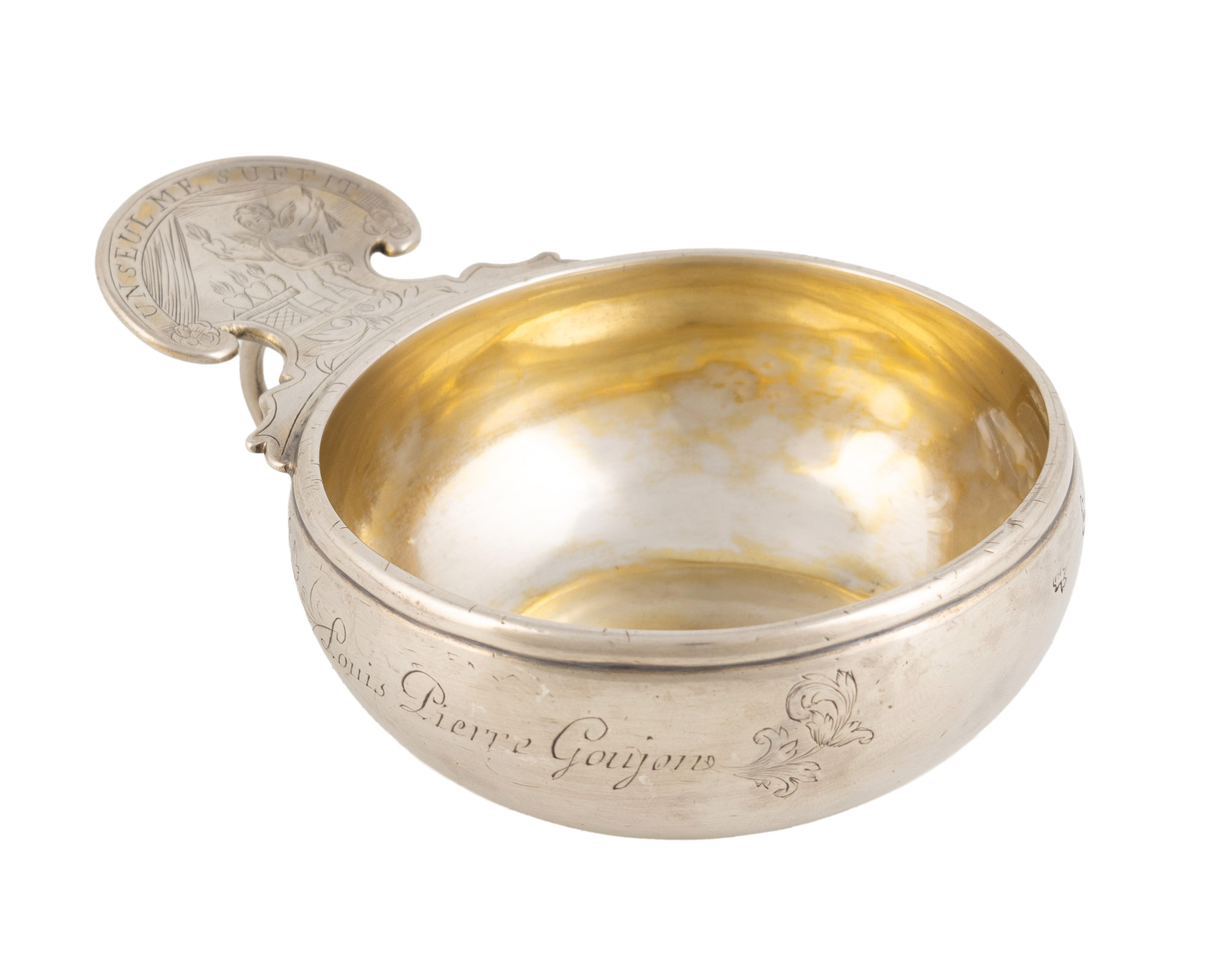 circular form, the shaped scroll thumb-piece engraved with a cherub (Eros) with four flaming hearts, also inscribed 'Un Seul Me Suffit', with a finger ring, the side inscribed 'Louis Pierre Goujon', the underside with a crest, length 11.2cm, approx. weight 4oz.
