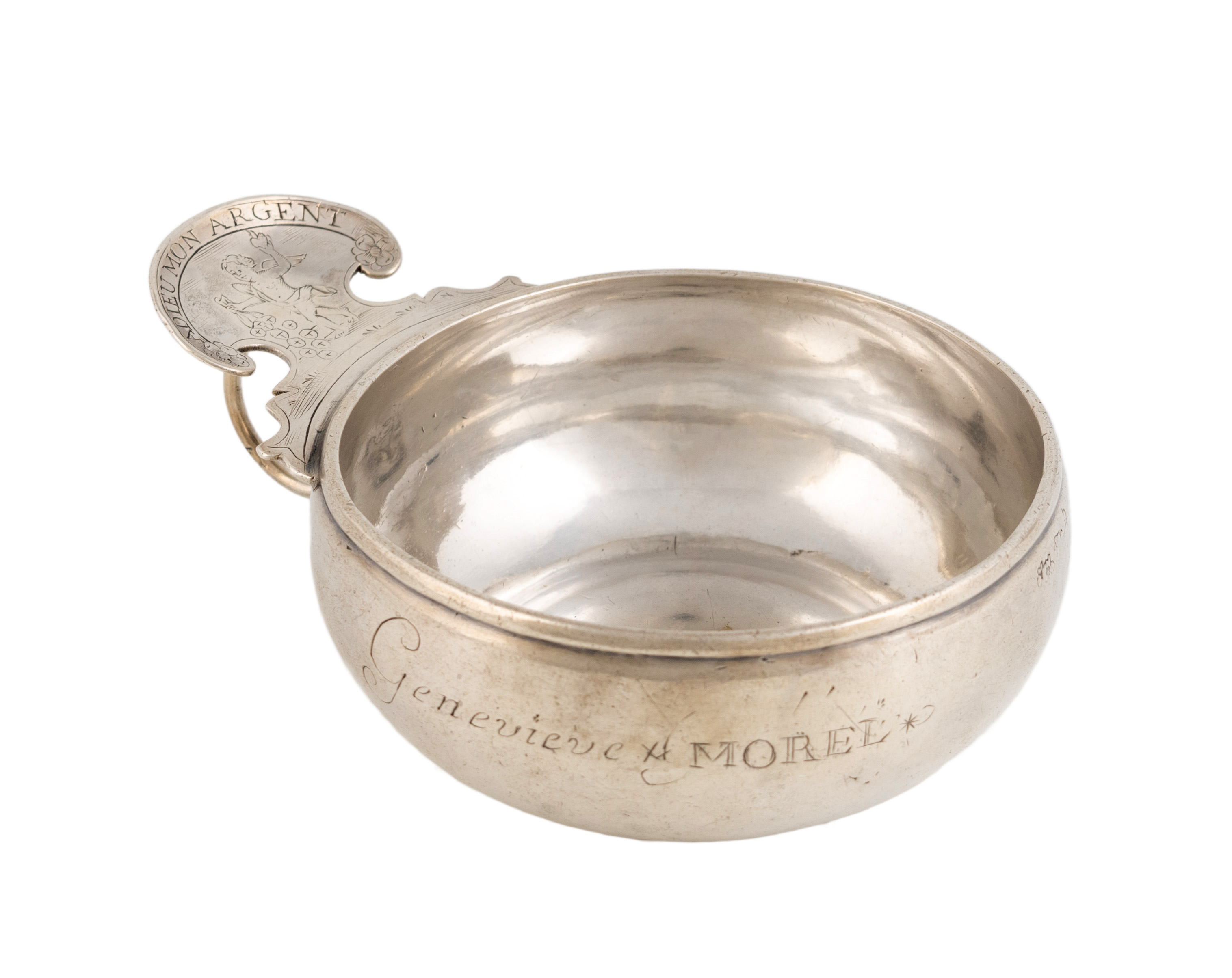 circular form, the shaped scroll thumb-piece engraved with a cherub holding a burst sack of money, also inscribed 'Adieu Mon Argent', with a finger ring, the side inscribed 'Genevieve Morel', length 11.3cm, approx. weight 2.9oz.