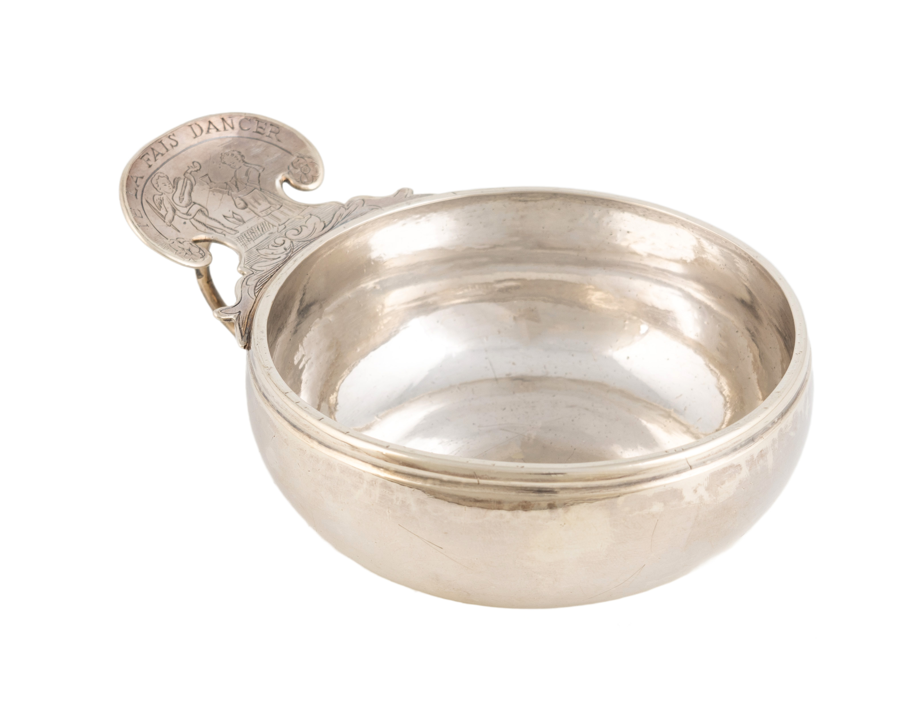 circular form, the shaped scroll thumb-piece engraved with a lady holding a glass of wine and a bottle and with a cherub playing a musical instrument, also inscribed 'Las Fais Danger', with a finger ring, length 11.7cm, approx. weight 3.3oz.