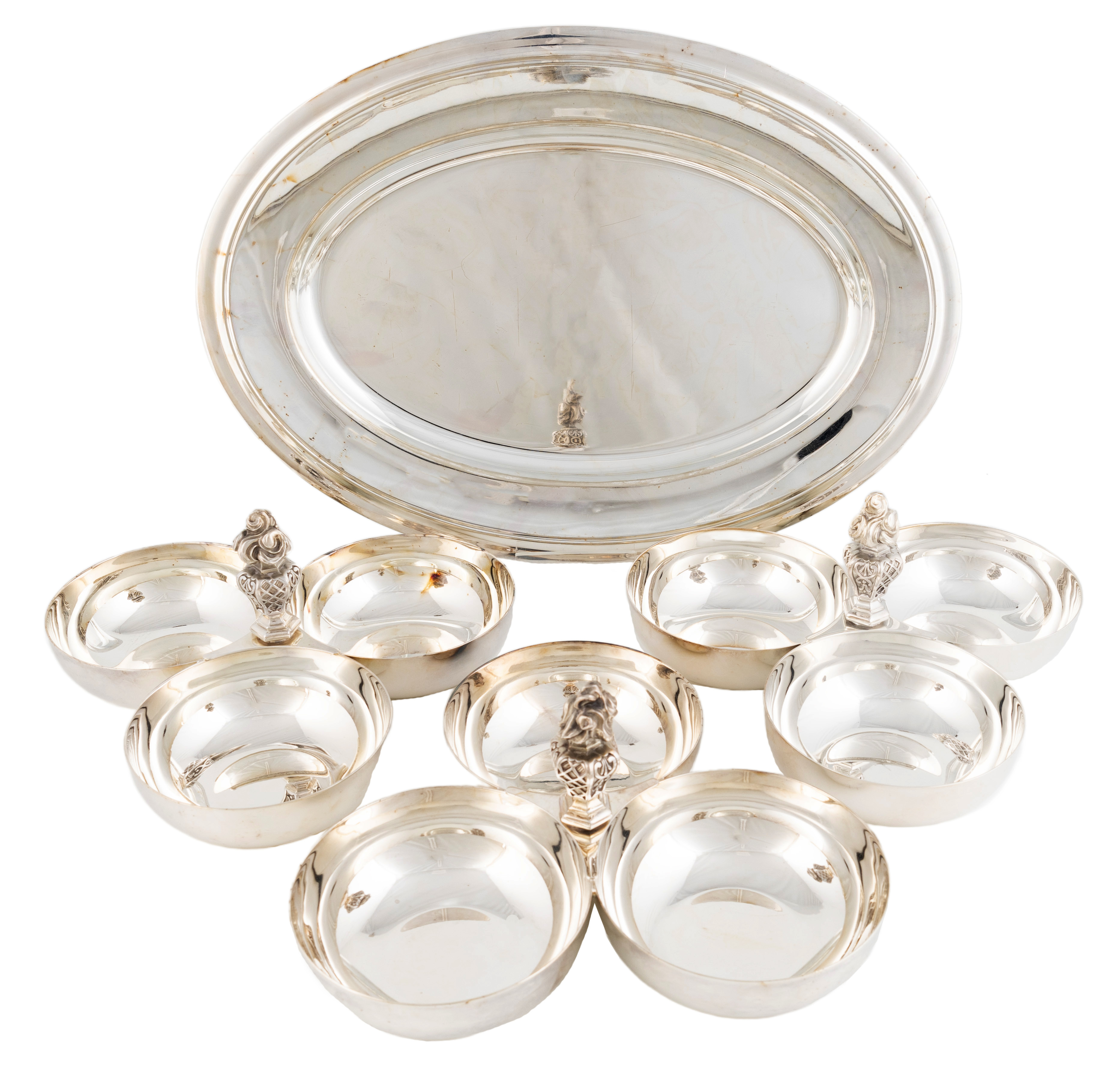 plain trefoil form with a central stylised knop and flame finial, plus a French electroplated serving dish by Christofle, plain oval form, length 40.2cm (4)