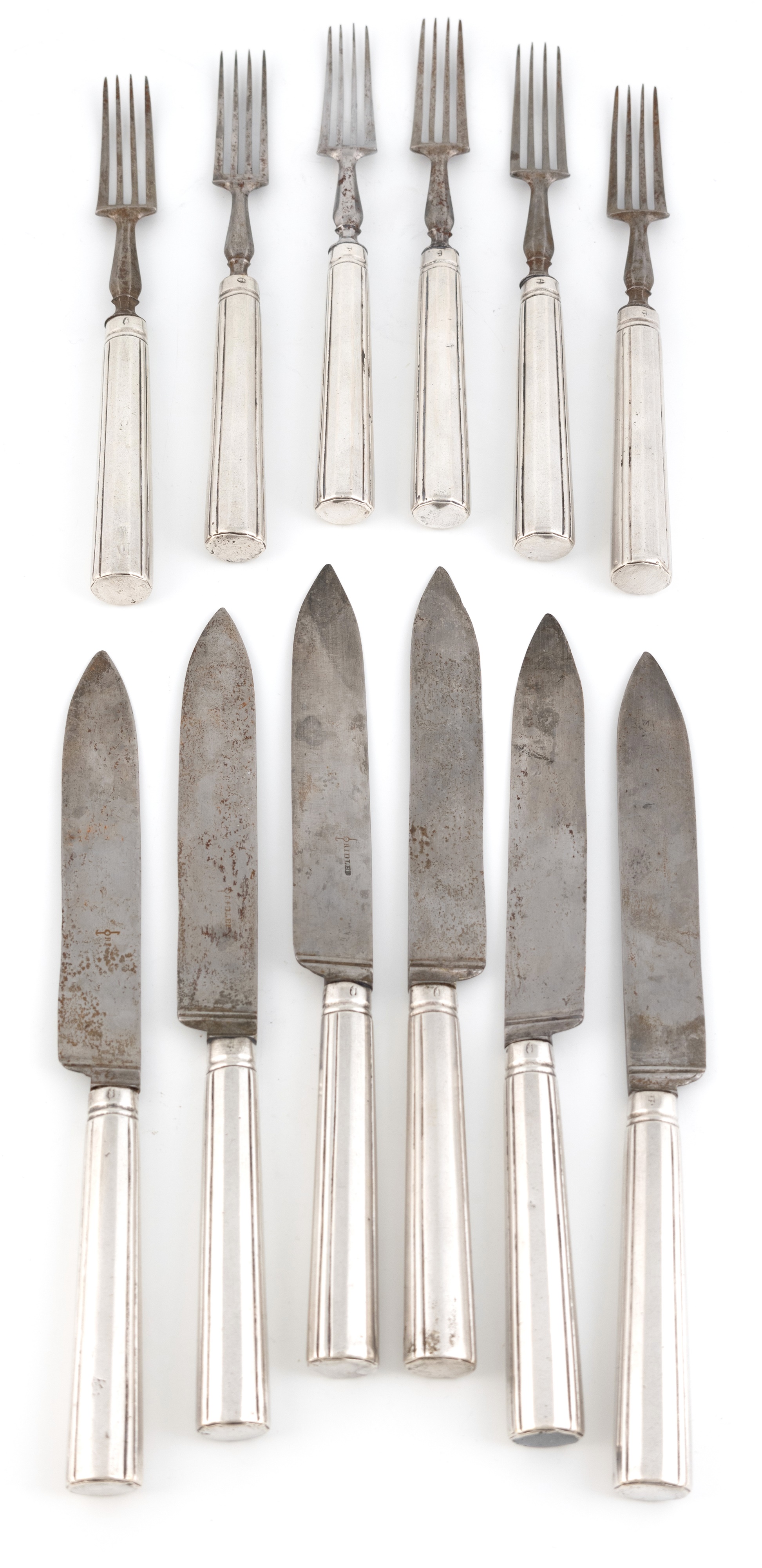 A set of six mid-18th century German silver table forks and knives,