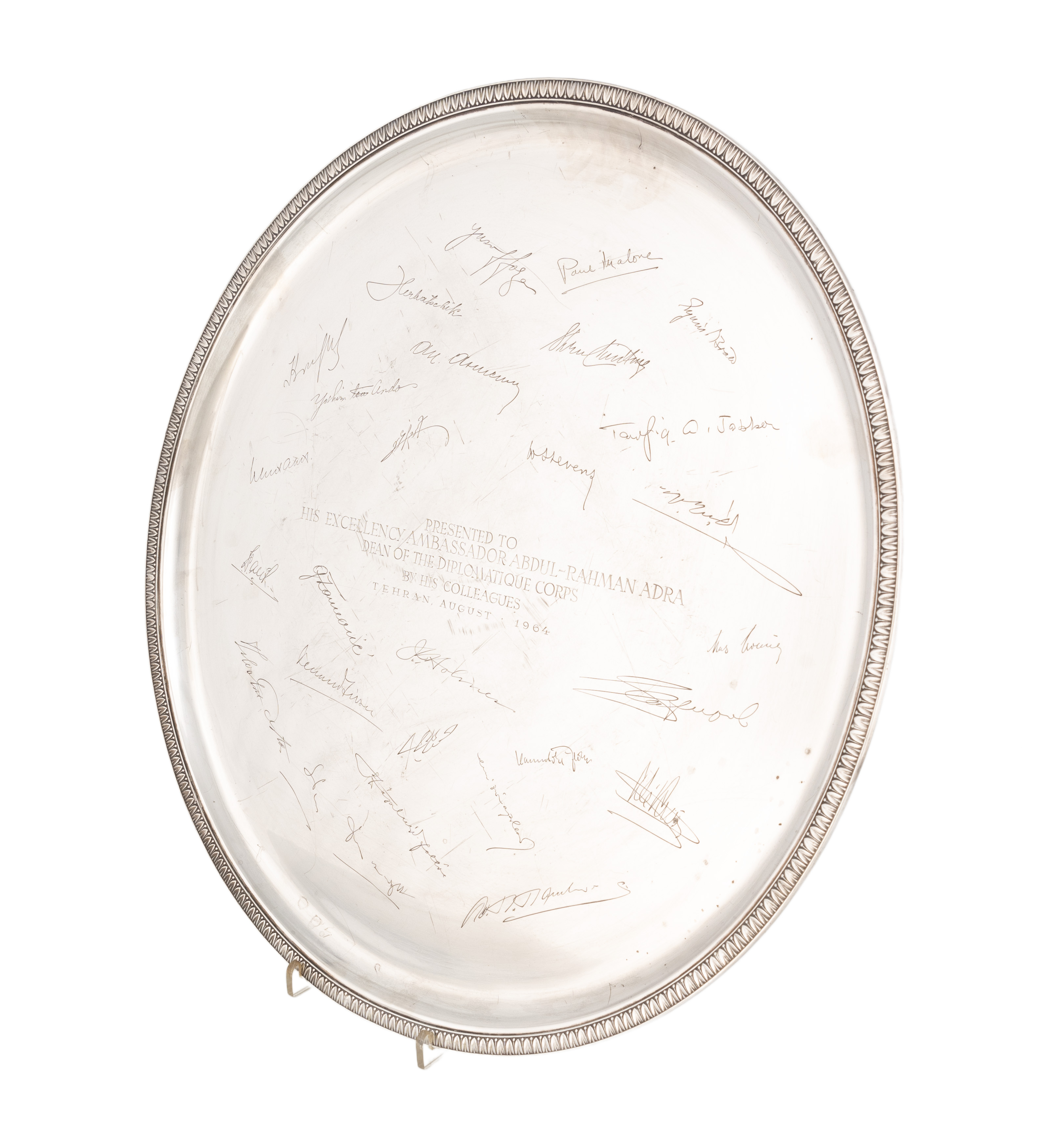 circular form with a leaf border, inscribed 'Presented To His Excellence Ambassador Abdul-Rahman Adra Dean of The Diplomatique Corps By His Colleagues Tehran, August 1964' with surrounding signatures, diameter 45cm, approx. weight 52oz.