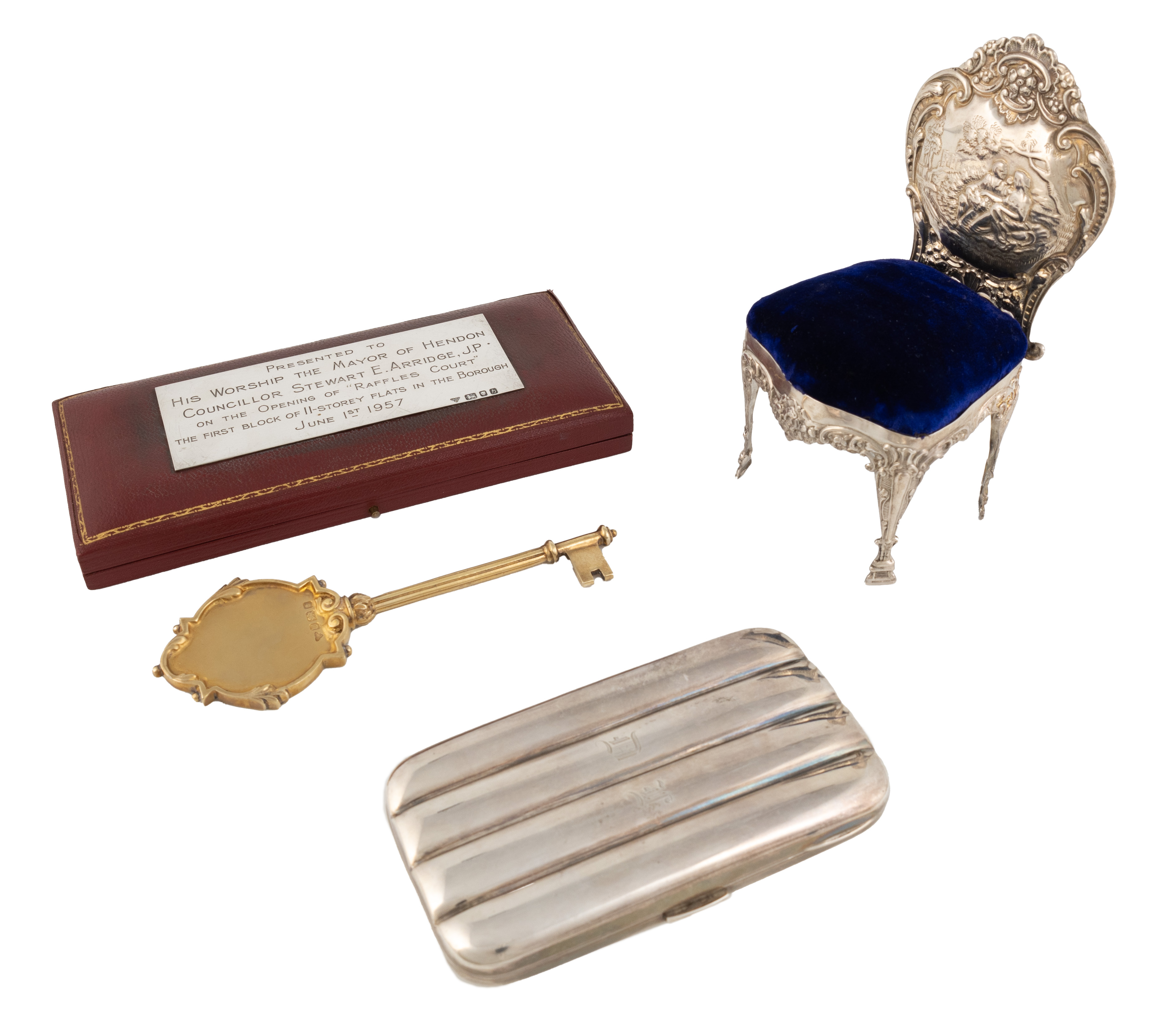 rounded rectangular form with engraved initials, length 12.6cm, plus a silver-gilt presentation key with a silver plaque mounted to the case and a silver chair, total approx. weighable 7.1oz. (3)