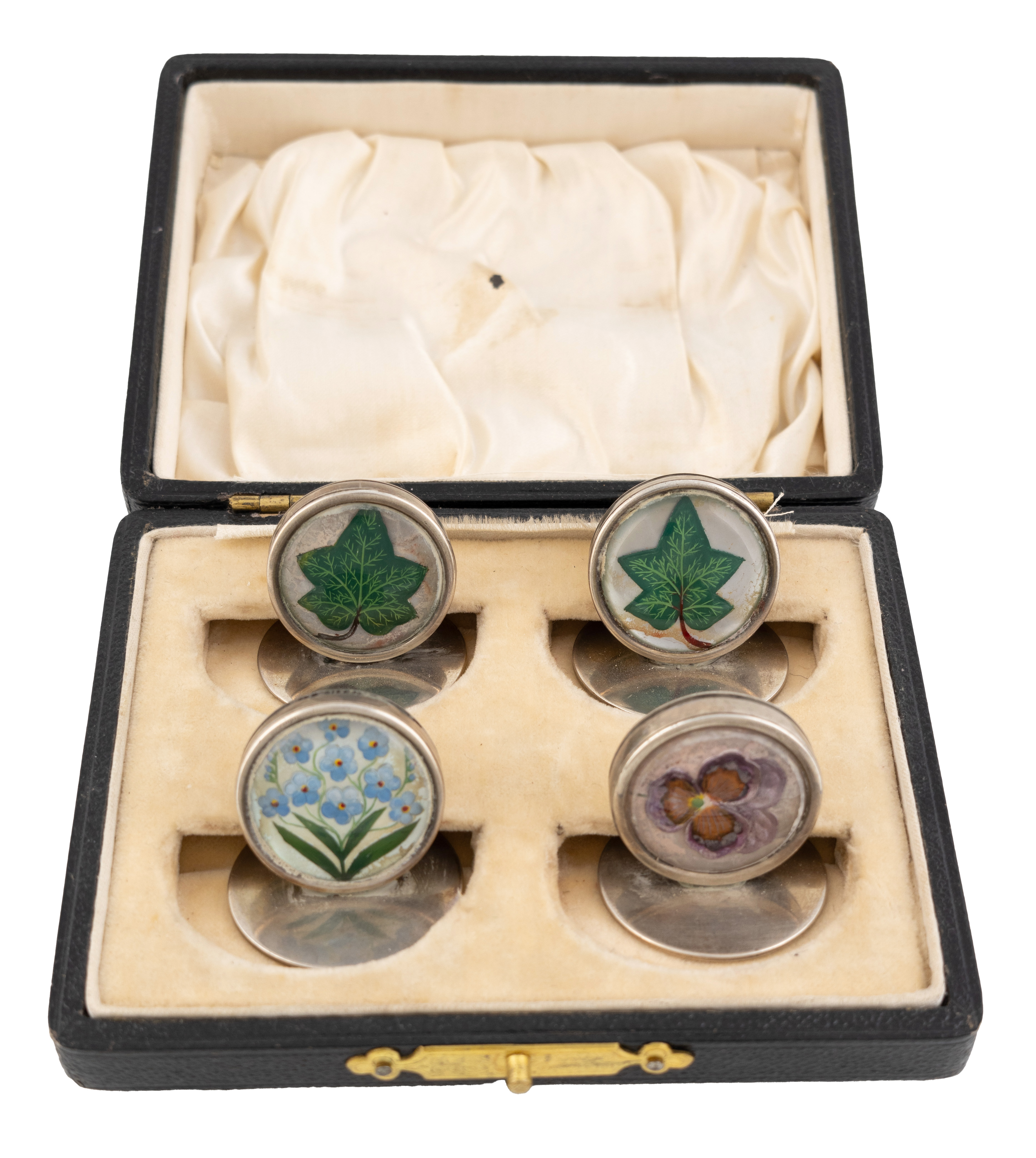 circular form, two with ivy leaves, one with a viola and one with forget-me-nots, on circular bases, in an associated case, length 3cm, total approx. weight 2.8oz. (4)