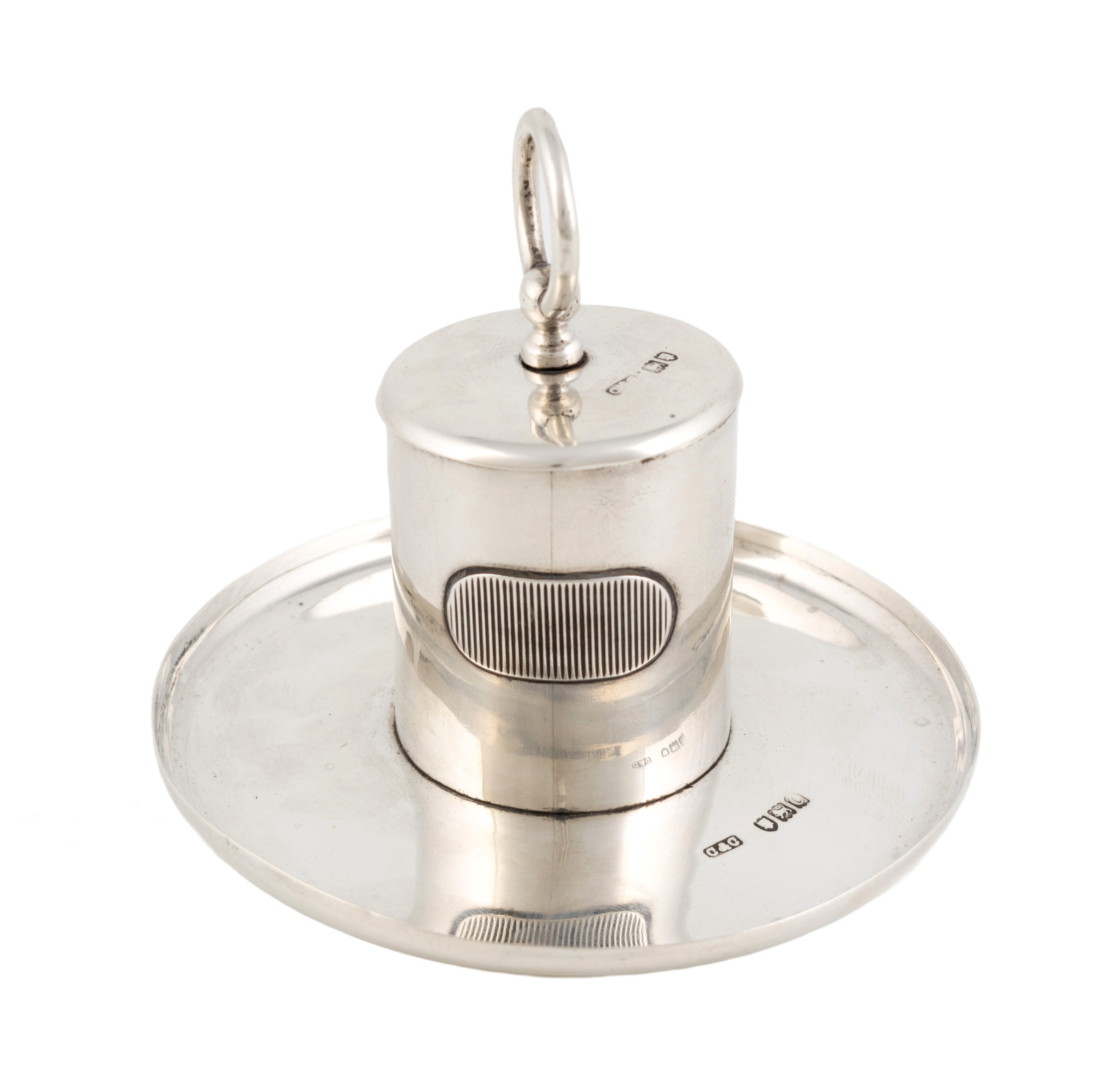 circular form with a central cylindrical compartment, pull-off cover with four interior compartments, diameter 9.4cm, approx. weight 3.1oz.