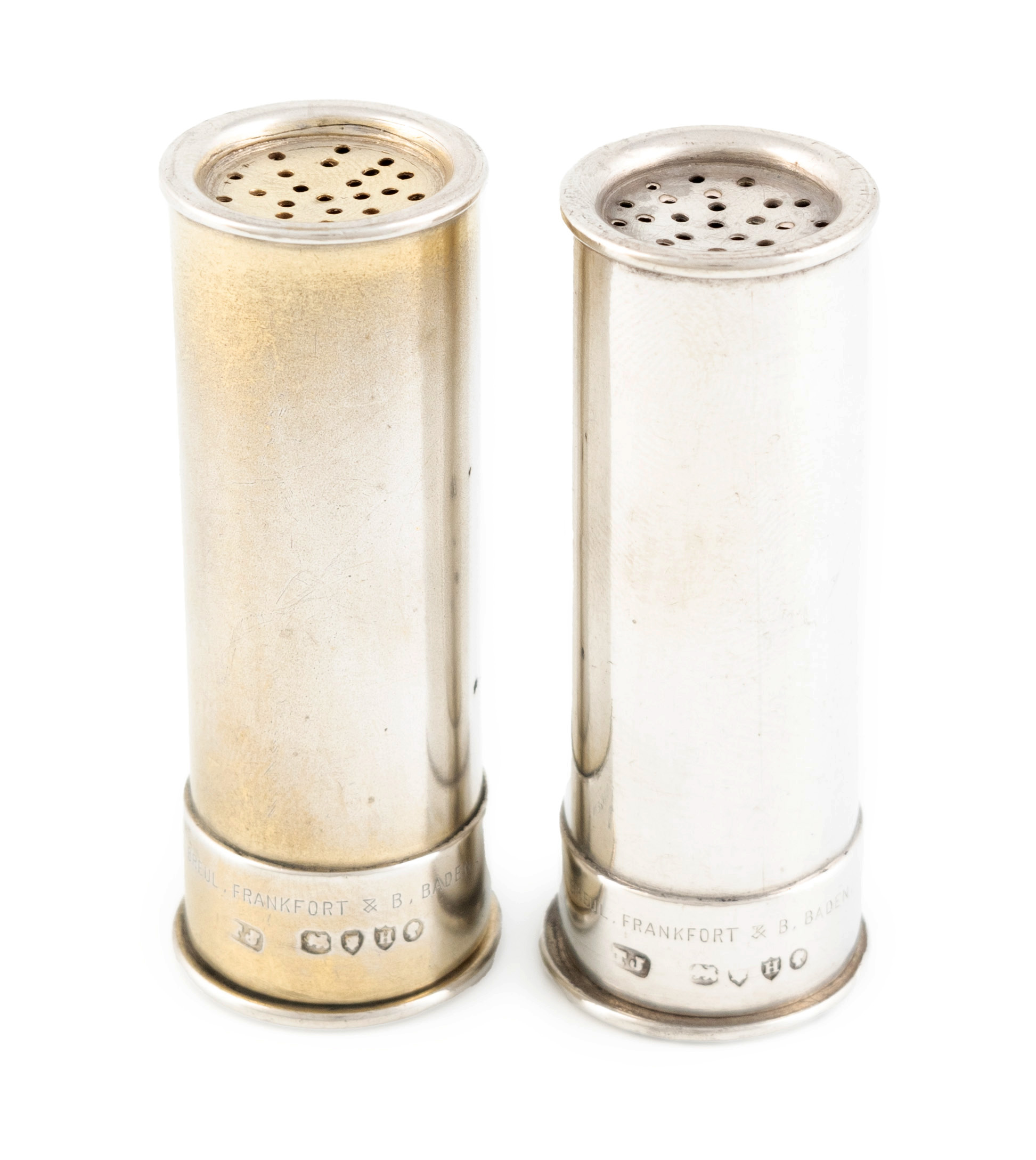 in the form of shotgun cartridges, one with worn gilded decoration, with pierced tops and screw-off bases, height 5.6cm, total approx. weight 1.7oz. (2)
