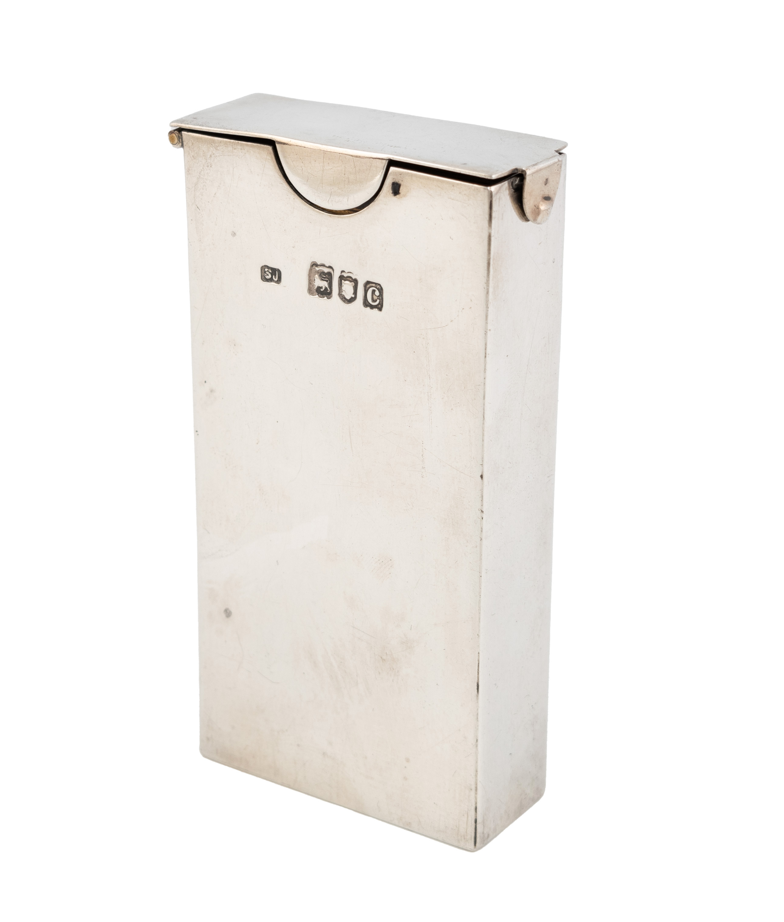 plain rectangular form, hinged cover with semi-circular thumb pieces to the sides, with a pack of domino cards, length 8.5cm, approx. weight 2.1oz.