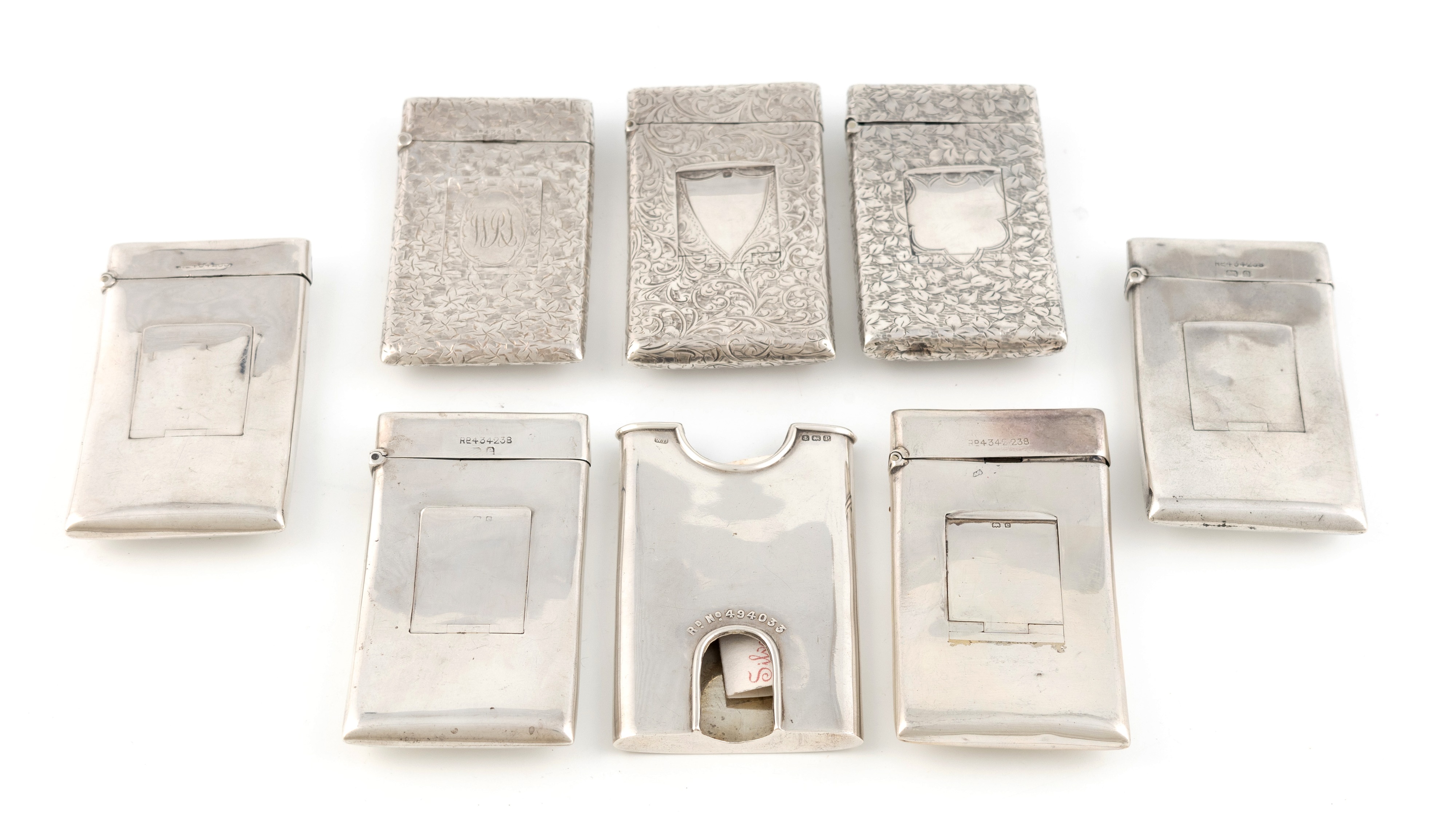 curved rounded rectangular forms, comprising: two by Walker & Hall, Sheffield 1905 and 1908, both with engraved foliate decoration, one by Mappin & Webb, Birmingham 1905, one by Robert Pringle, Birmingham 1904, two by Nathan & Hayes, Birmingham 1904, one with engraved initials, one by Constantine & Floyd Ltd, Birmingham 1903, and a card case by William Devenport, Birmingham 1914, total approx. weight 14.4oz. (8)