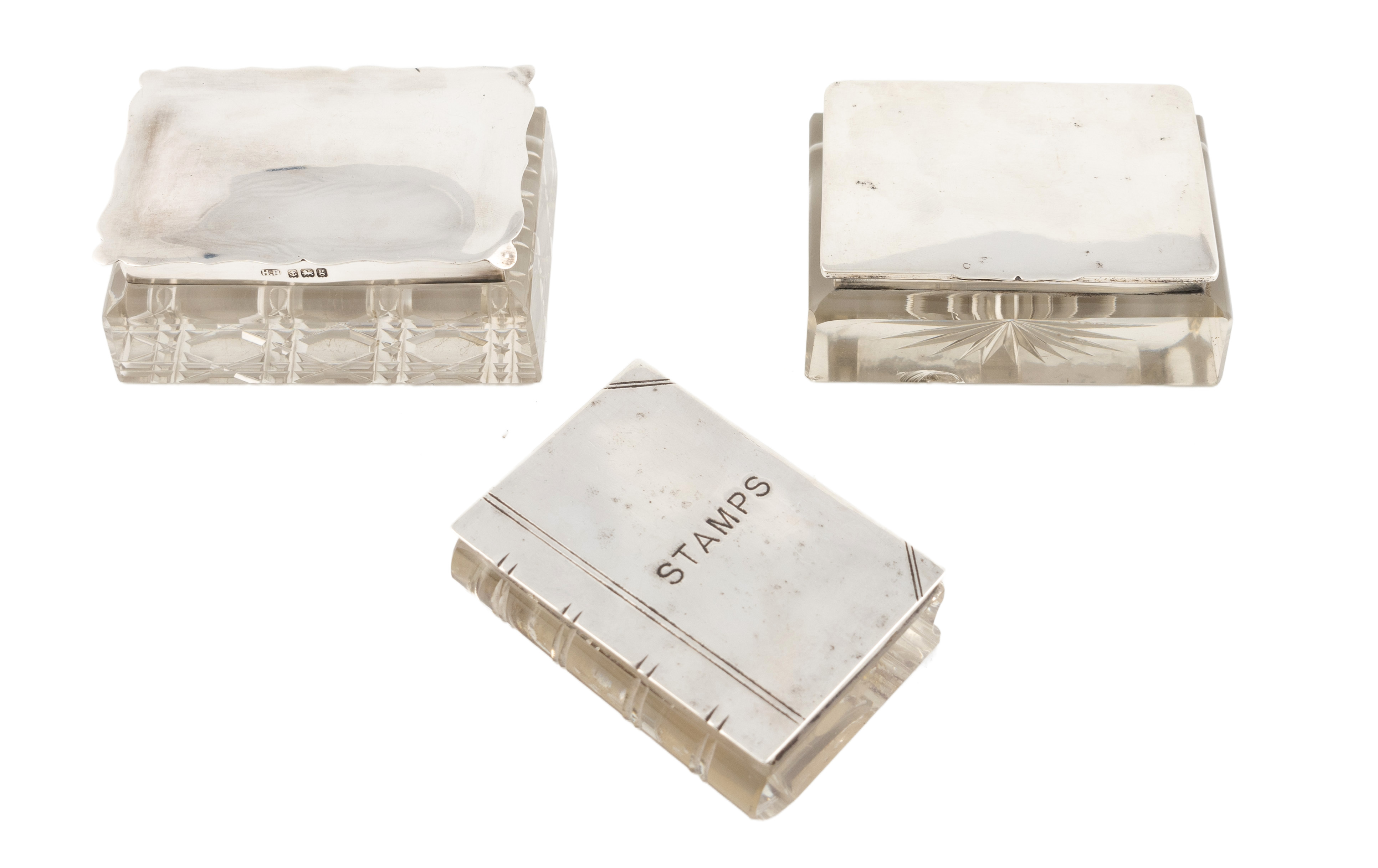 Three silver-mounted glass stamp boxes,