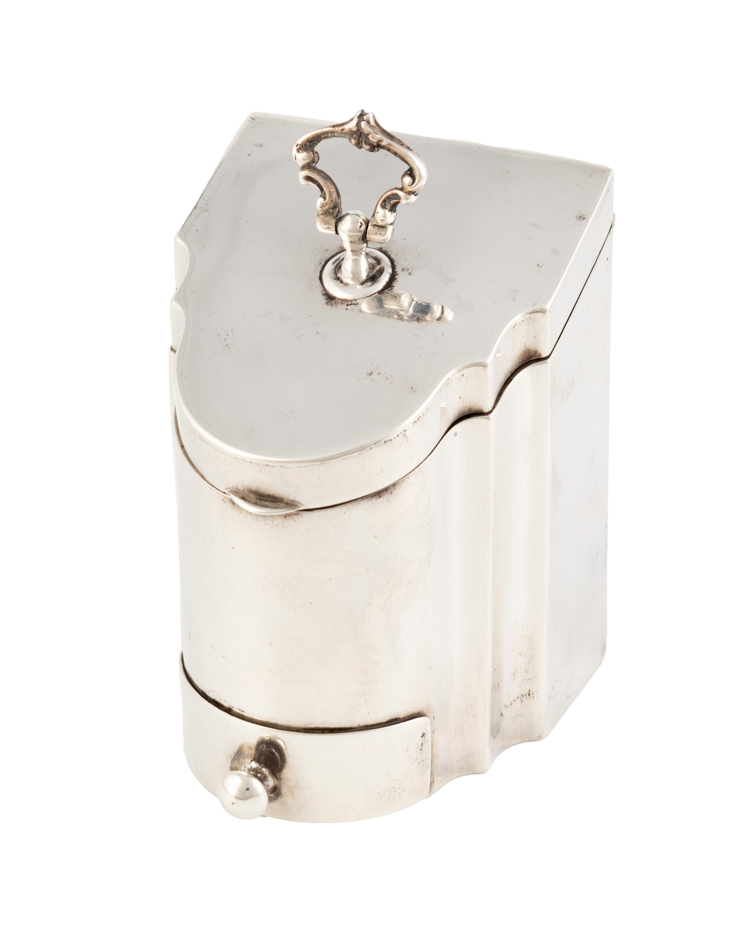 knife box form, the interior with a stamp compartment and a fitted glass inkwell, pull-out drawer to the base, height 8.5cm, approx. weight 6.6oz.