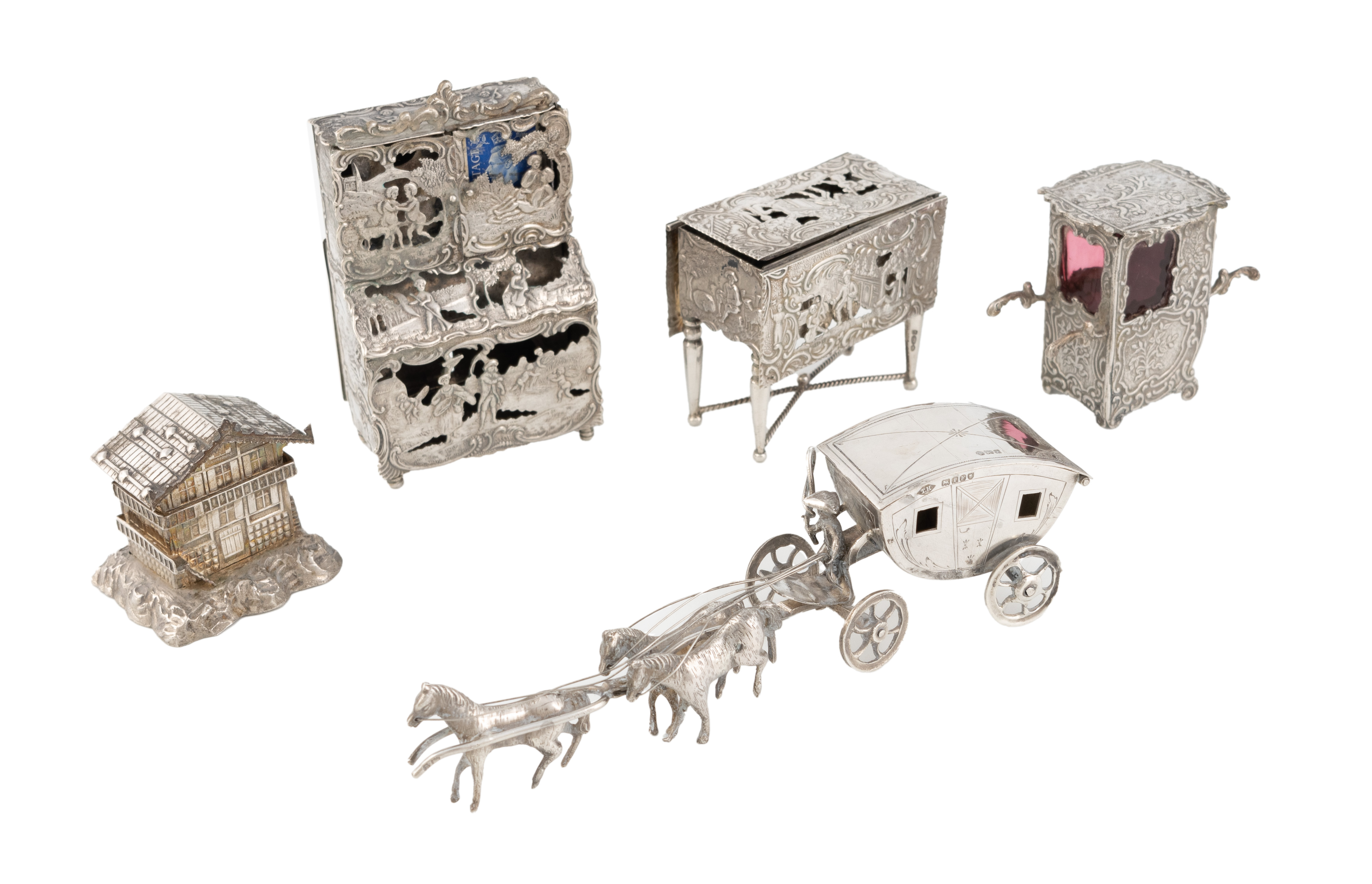 comprising: one with importers' marks of Theodor Hartmann, London 1904, in the form of a carriage with three horses, a Dutch drop leaf table with a pierced cover and a stamp compartment, a Dutch bookcase cabinet with pseudo marks, with pierced and embossed rural scenes, a German stamp box modelled as an Alpine chalet, and a German sedan with embossed foliate decoration, total approx. weighable 12.9oz. (5)