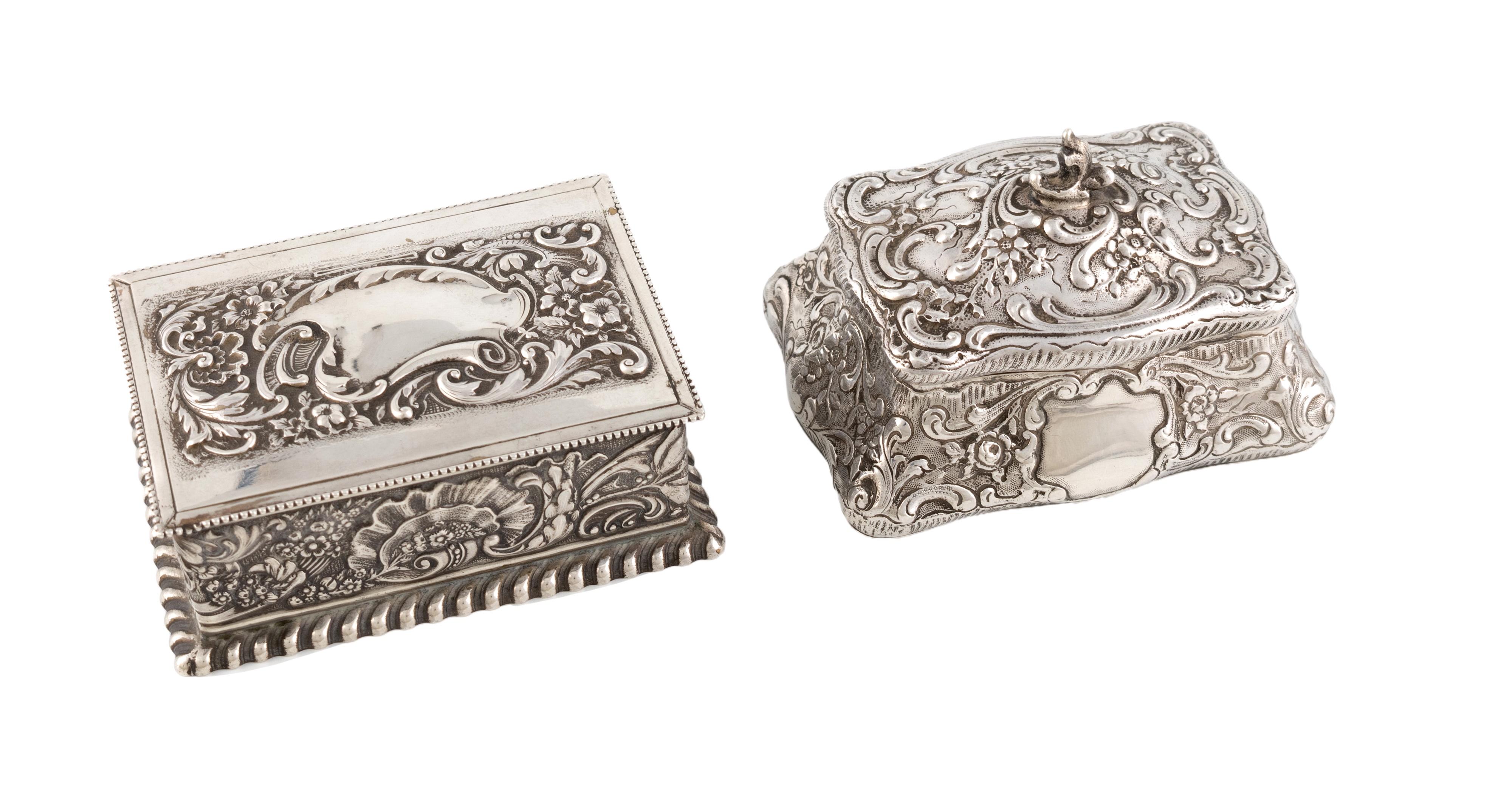 rounded rectangular form with chased scroll foliate decoration, the other by Gorham, rectangular form with beaded and gadrooned borders, embossed foliate decoration, length 8.4cm, total approx. weight 9.7oz. (2)