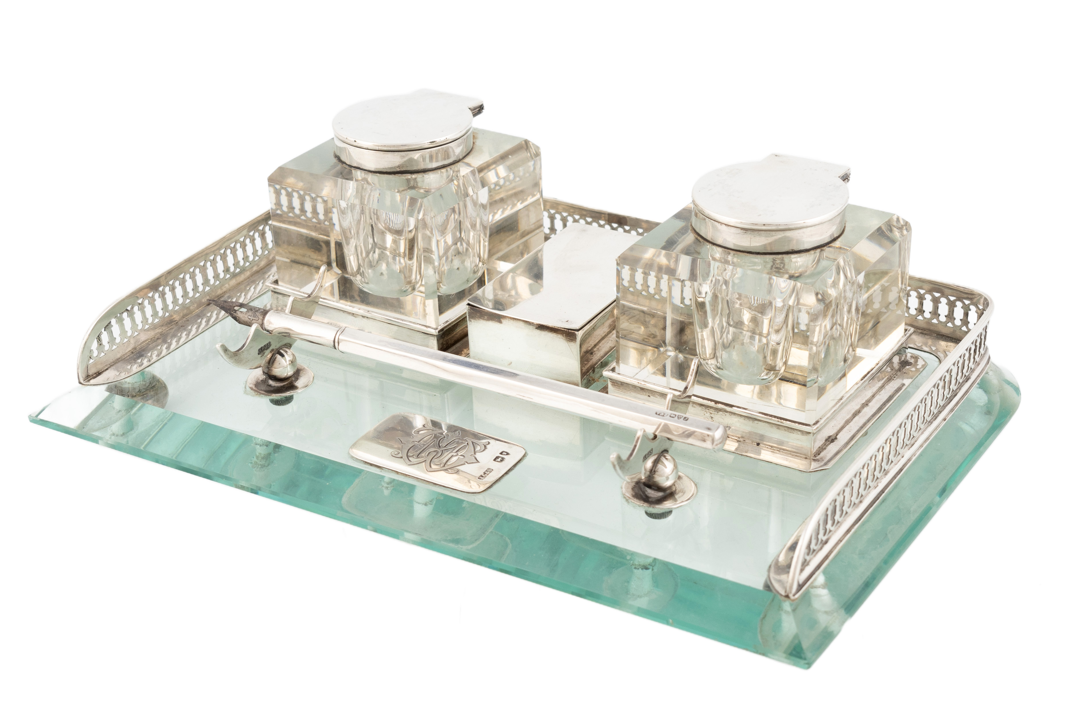 rounded rectangular form with a pireced decorated gallery, with two silver-mounted inkwells, a stamp compartment, a pen rest, an engraved monogram plaque, length 23.2cm, plus a silver ink pen by Villiers & Jackson, Chester 1909. (2)