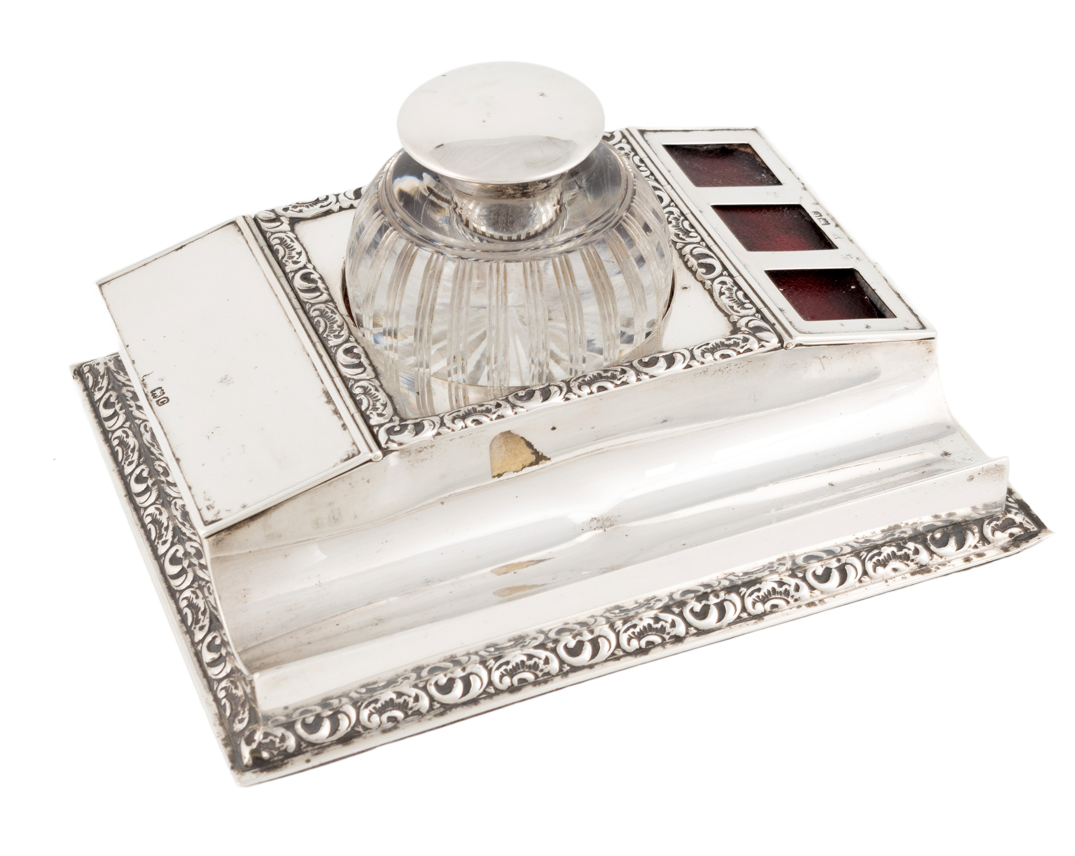 rectangular form with scroll foliate borders, with a front pen tray, two hinged compartments one for stamps, and a central silver-mounted cut-glass inkwell, length 16.8cm.