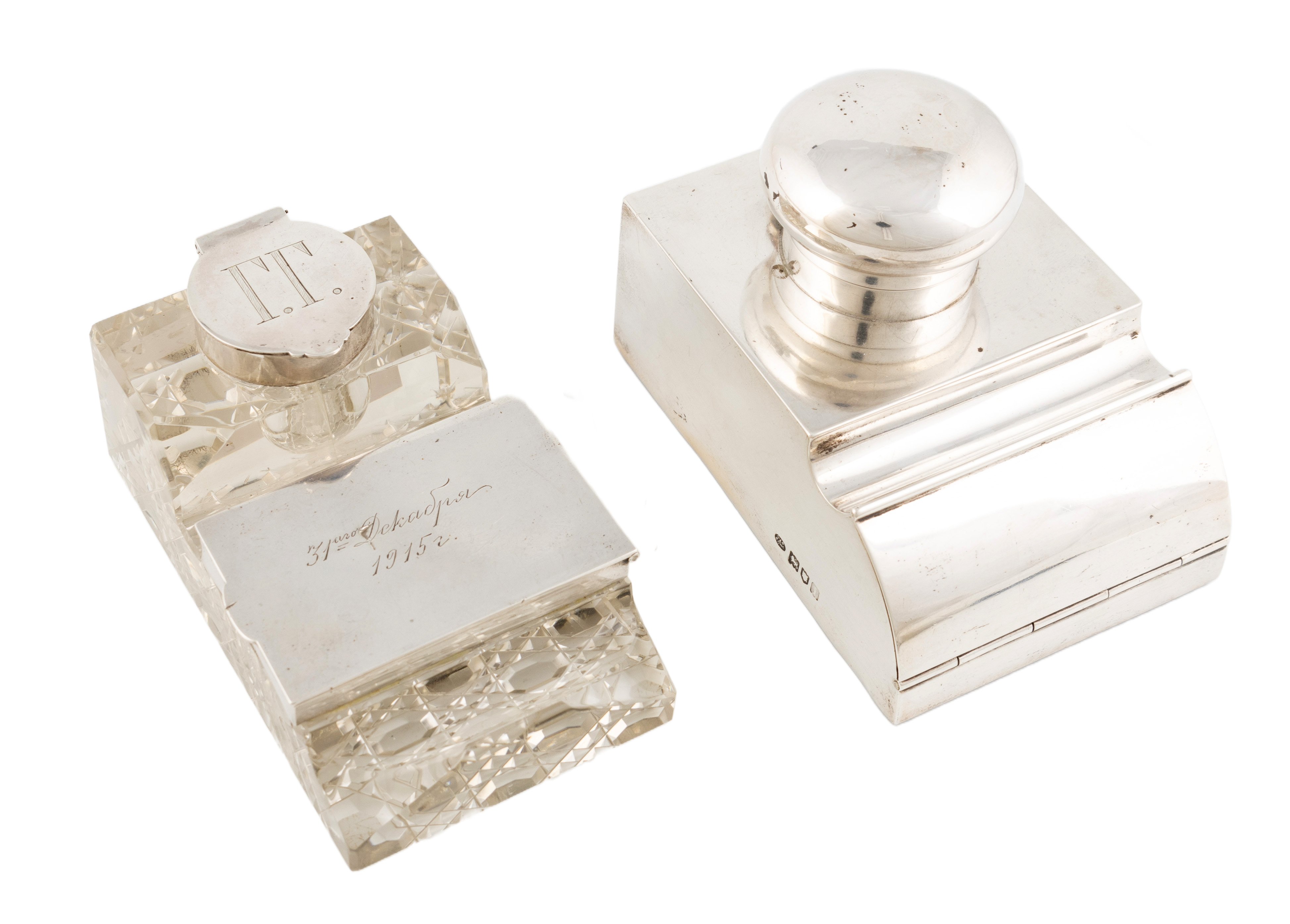 plain rectangular-shaped form, stamp compartment to the underside of the hinged front, glass liner to the inkwell, plus a Russian silver-mounted glass inkwell and stamp box, maker's mark AOM, Moscow circa 1915, length 10.8cm. (2)