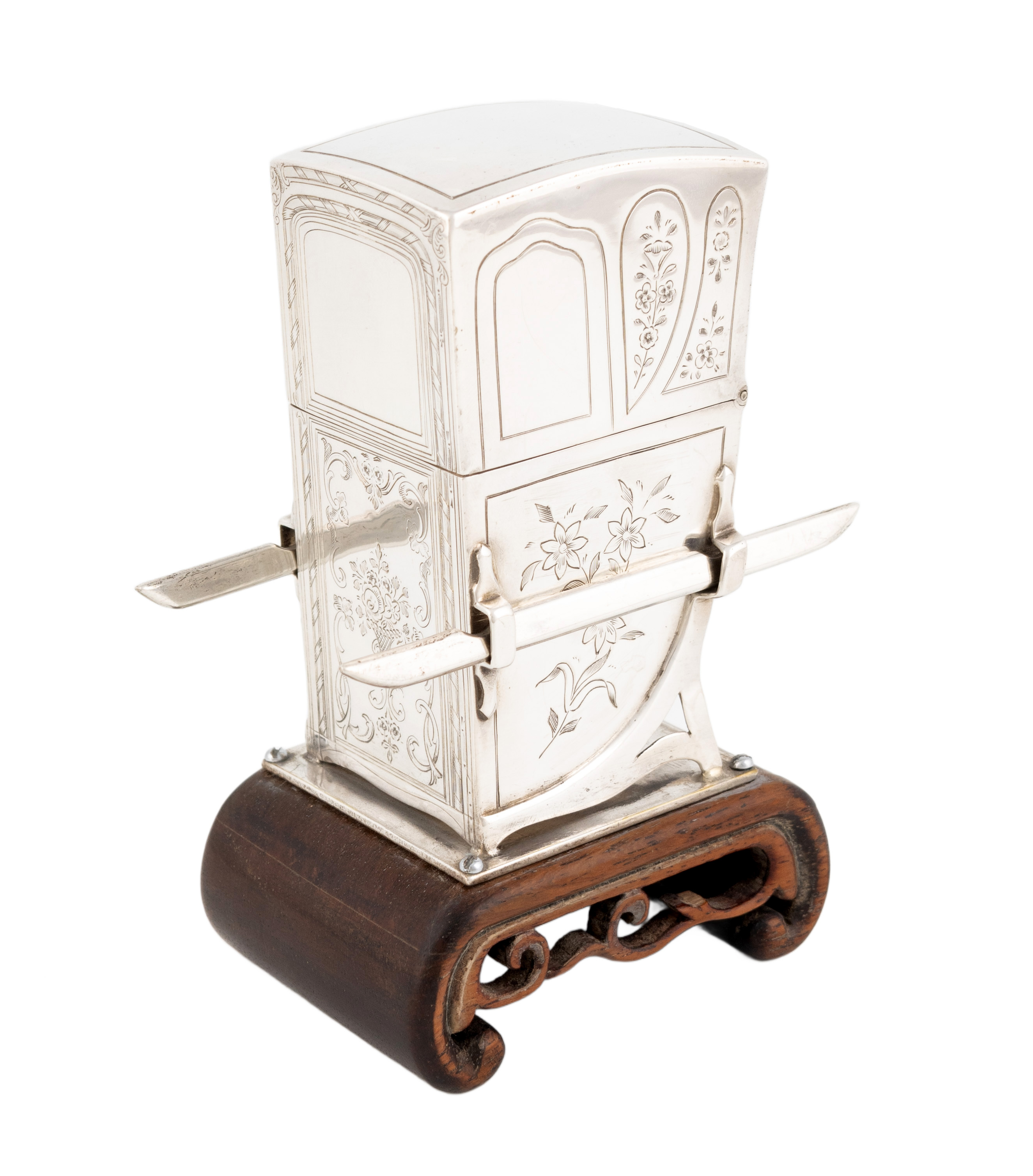 modelled as a Sedan Chair with a hinged top, pull-out carrying poles, engraved with foliate decoration, on a carved wooden plinth, height 12cm.