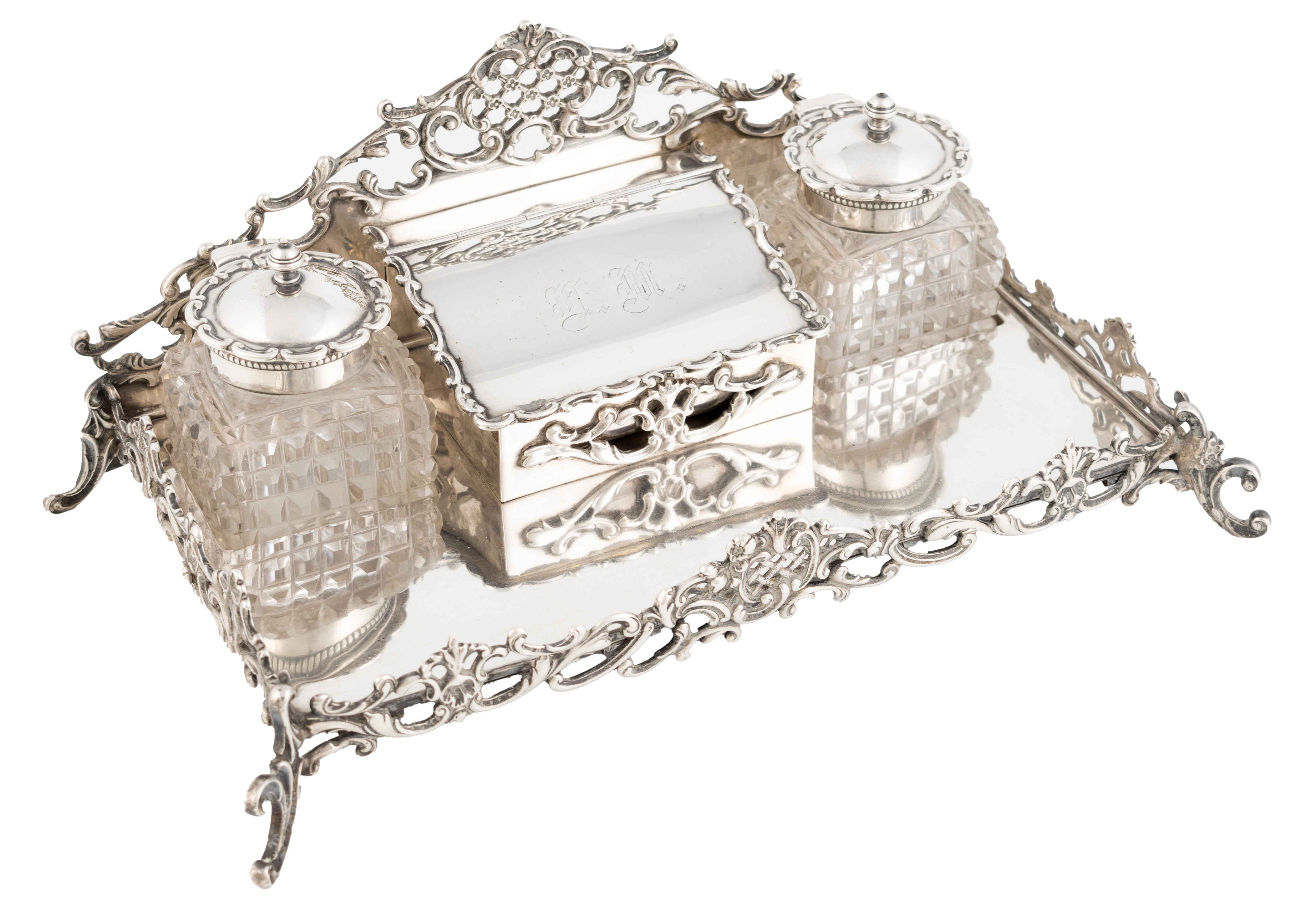 rectangular form with pierced scroll foliate decoration, with two silver-mounted cut glass inkwells and a central engraved hinged stamp compartment, on four scroll feet, length 24cm, approx. weight 16.5oz.