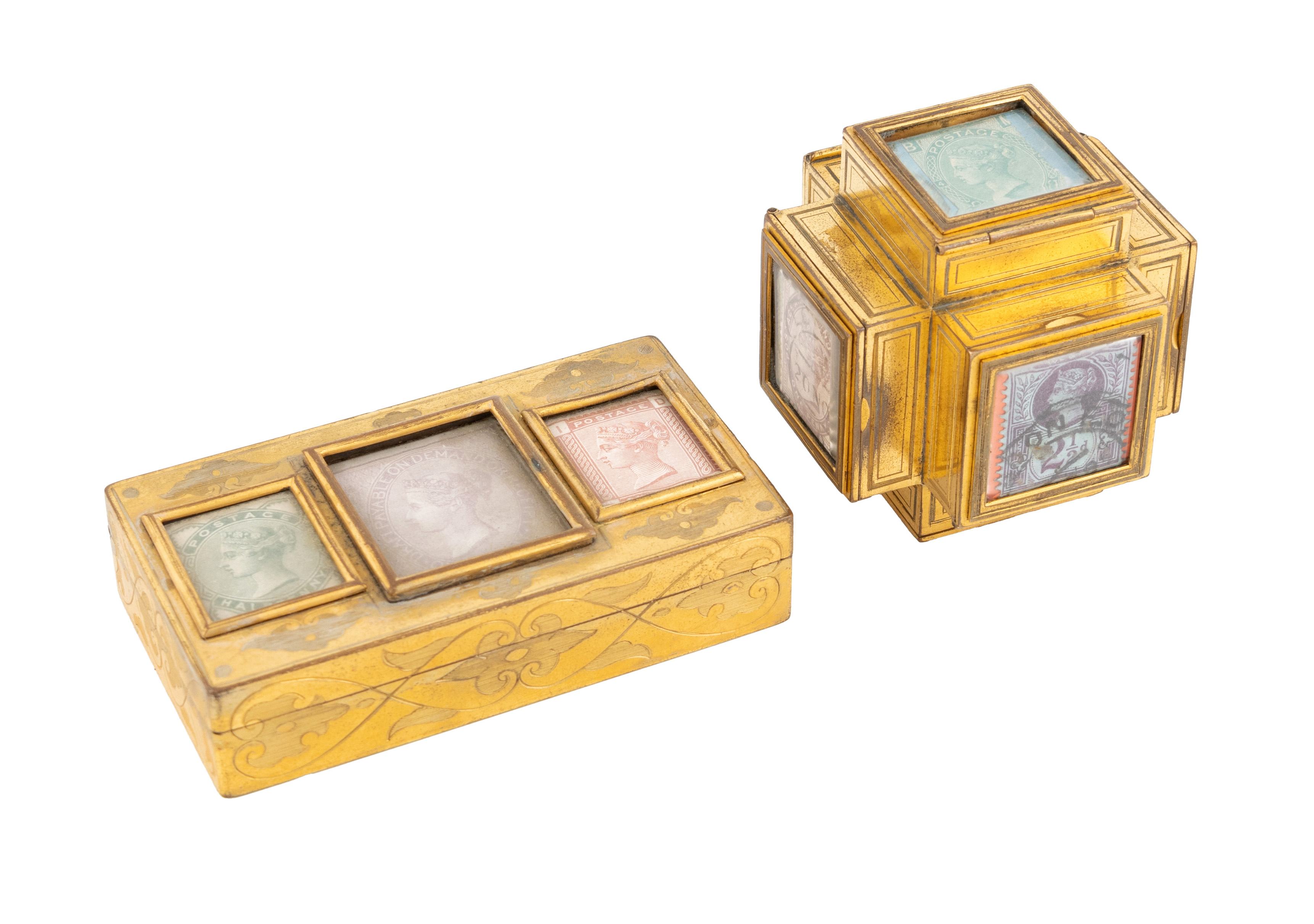rectangular form with engraved scroll foliate decoration, the cover with three windowed glass stamp compartments, length 9.2cm, the other of cube form with glass hinged compartments to each side. (2)