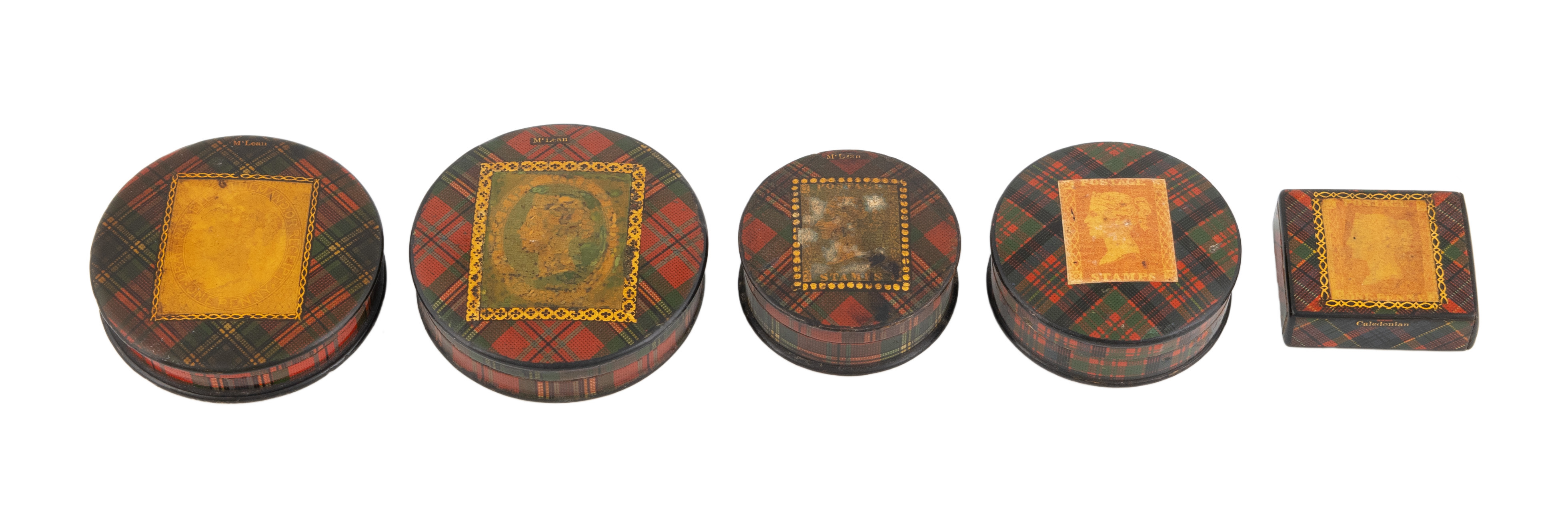 of circular and rectangular forms, all with stamps to the covers, three of Maclean, one of Cameron and one Caledonian tartan, diameter 5.4cm. (5)