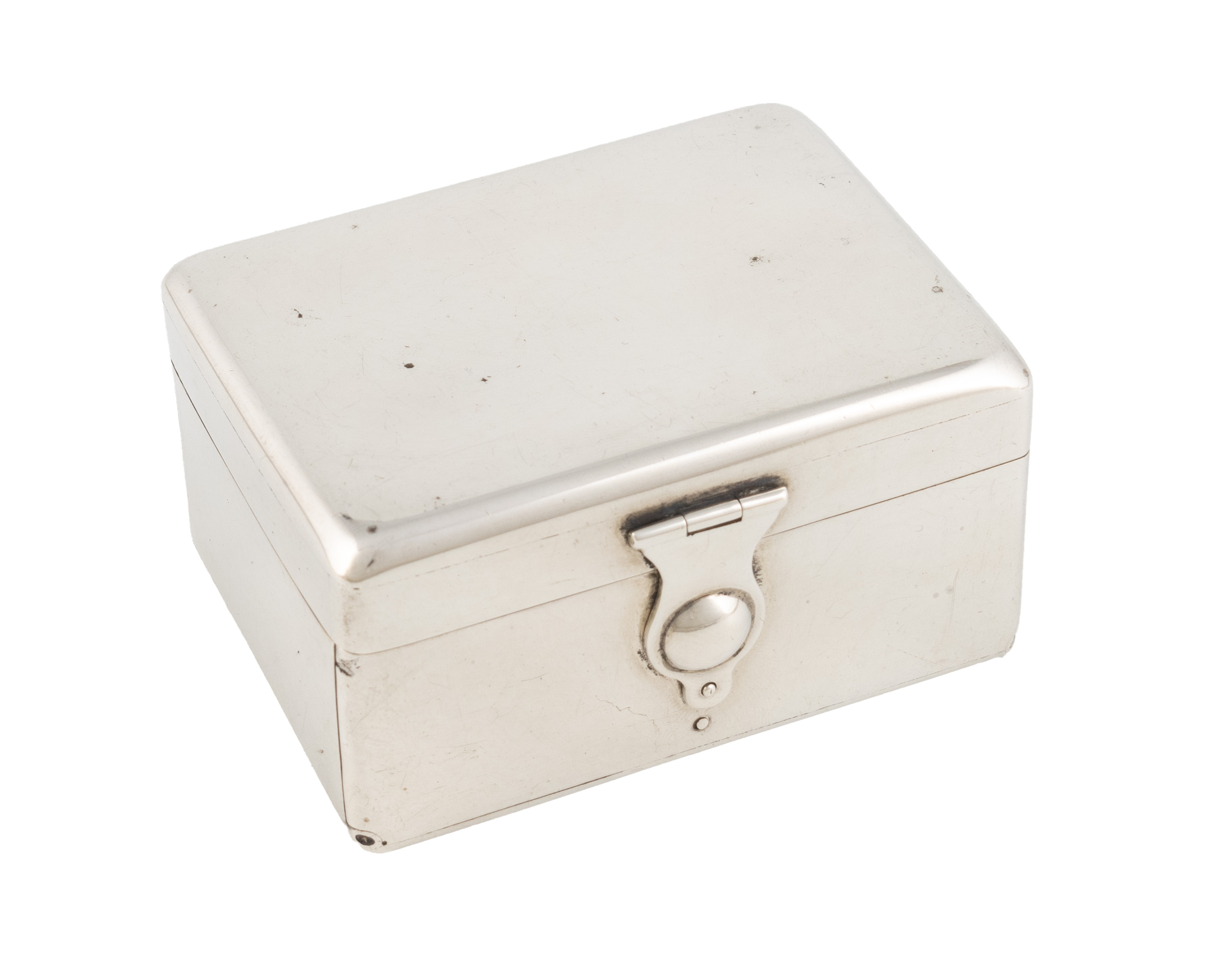 plain rounded rectangular form, to the interior hinged candle and taperstick holders, a sprung miniature glass inkwell, a match compartment with a striker cover and a pull-out stamp compartment, length 7.8cm, approx. weight 10.2oz.
