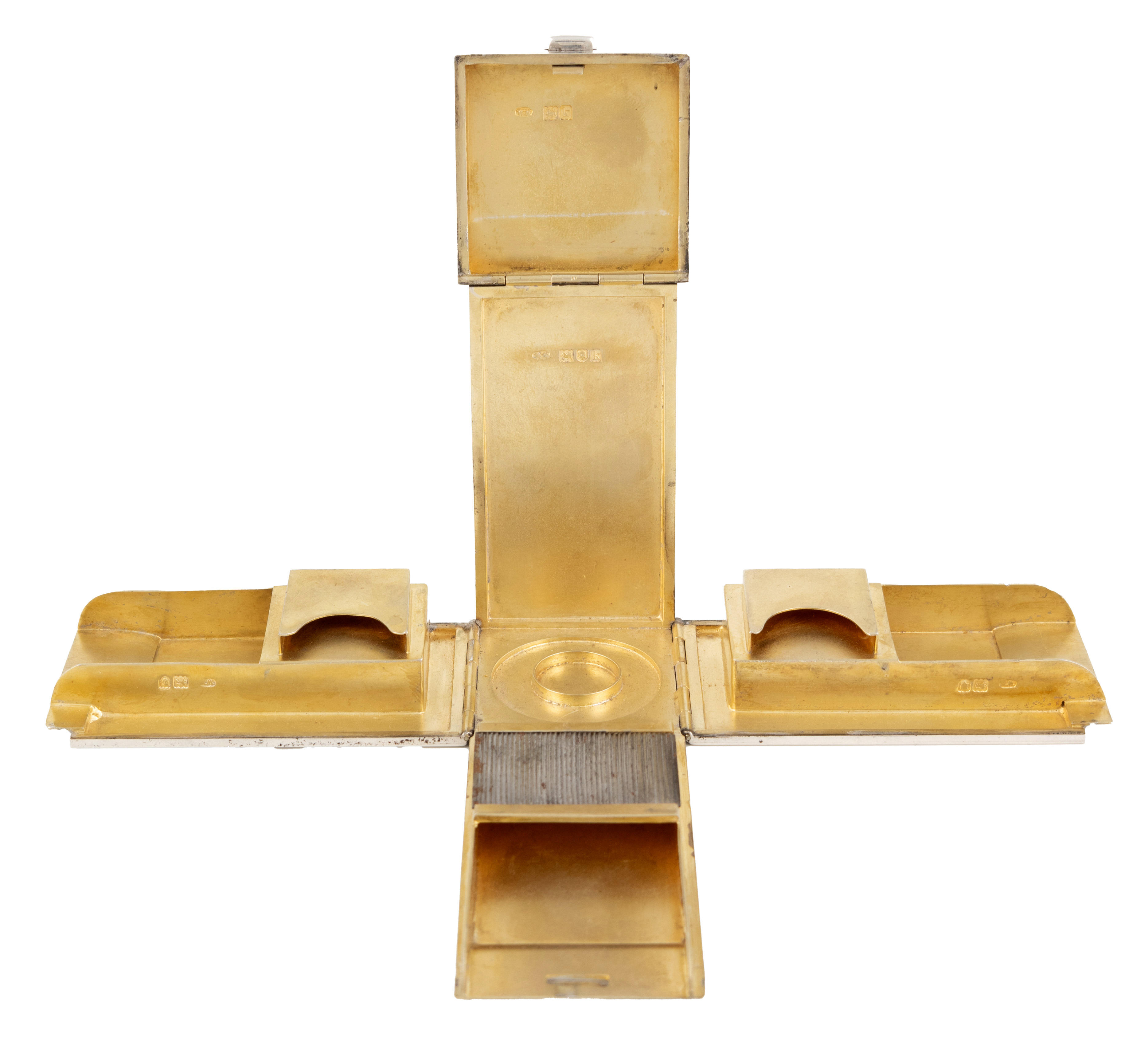 plain rectangular form, the interior with two stamp compartments and three others and striker, the bases with a recess for a taperstick, height 8.5cm, approx. weight 7.8oz.