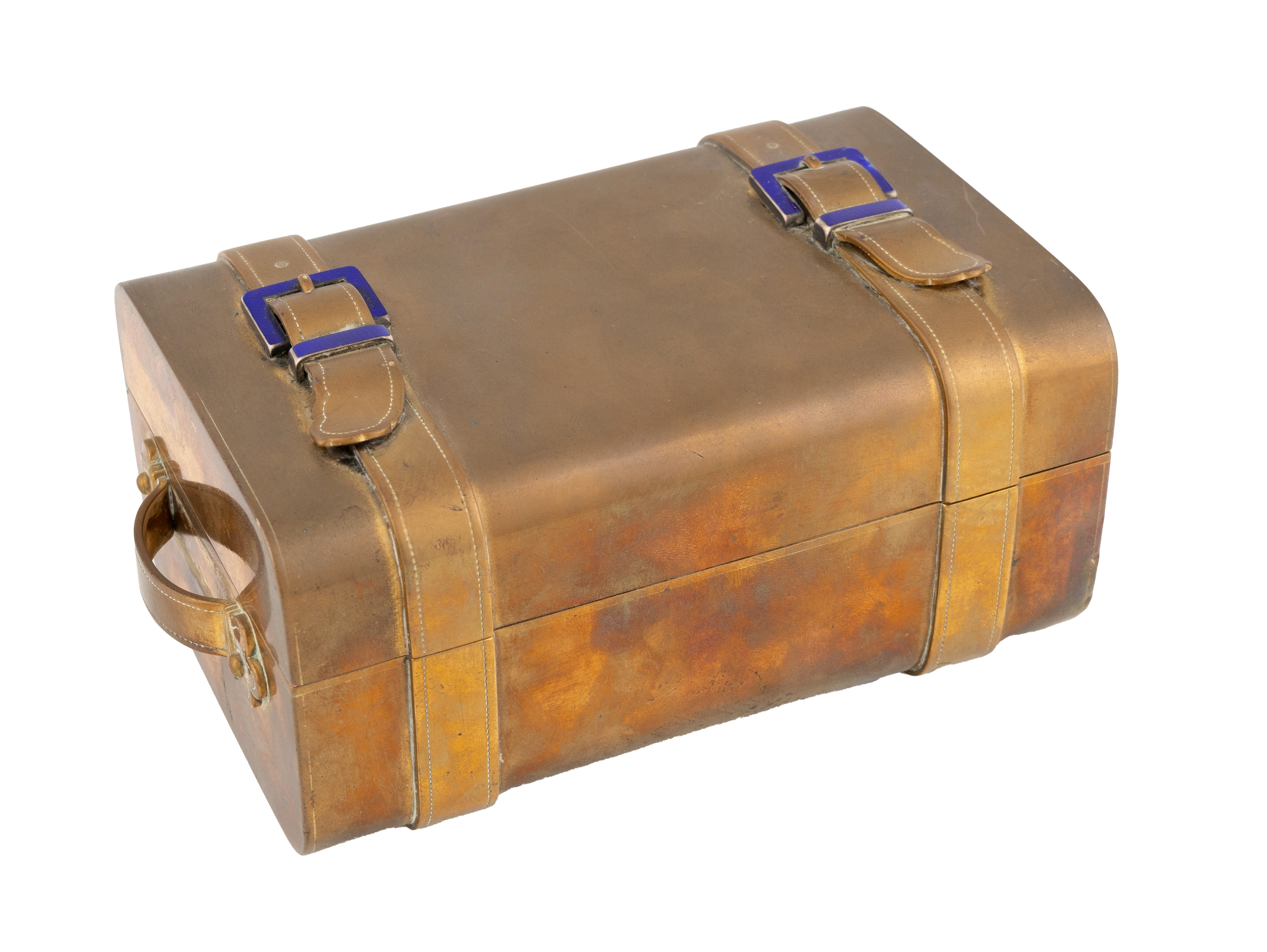 in the form of a trunk with blue buckles, to the underside of the cover a white enamelled dial watch, to the interior a taperstick, an inkwell, stamp and match compartment, the covers engraved 'Lights', 'Ink' and 'Stamps', length 17.8cm.