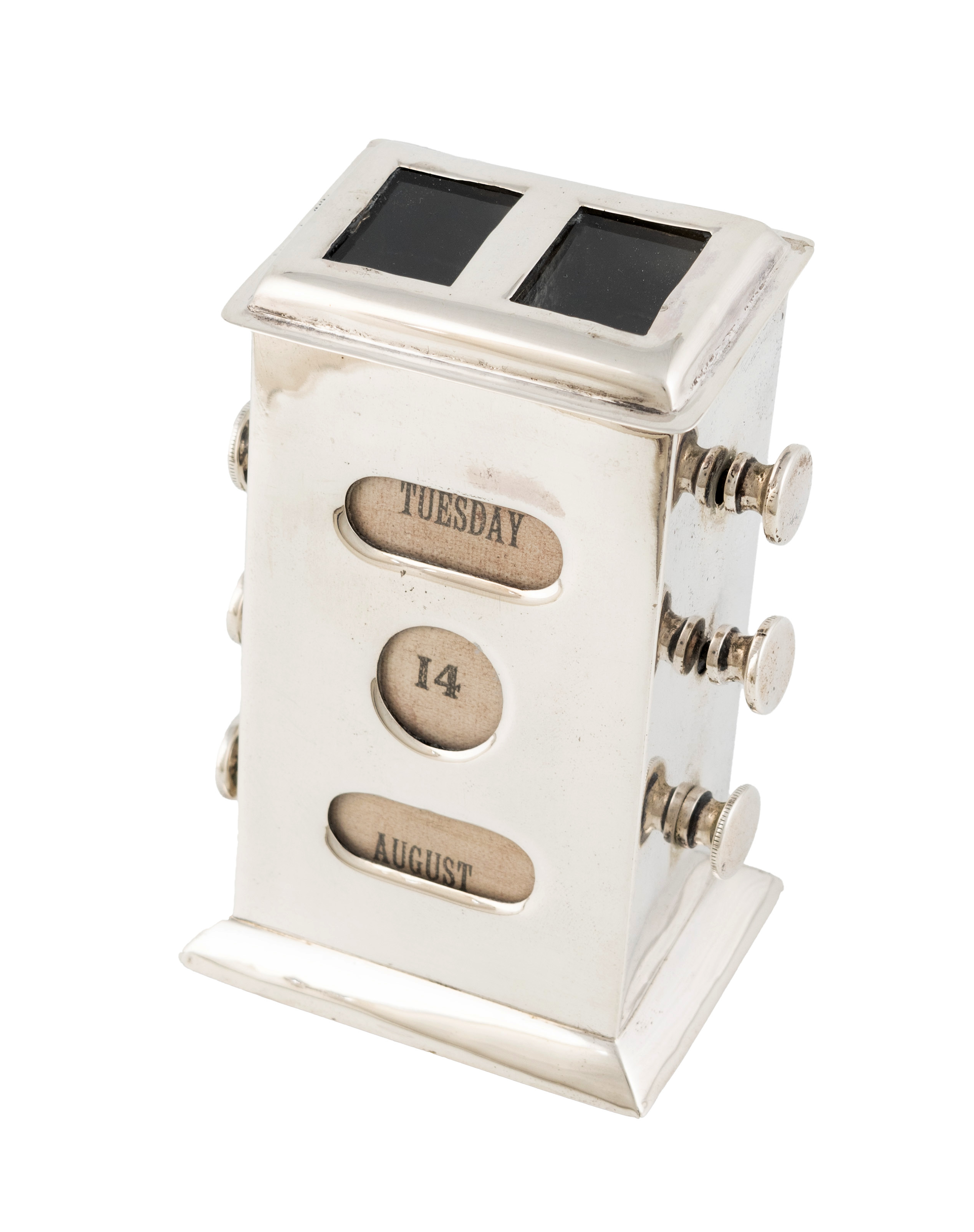 rectangular form with rotating knobs, showing date, month and day of the week, two glass window compartments to the top, with a loaded base, height 10cm.