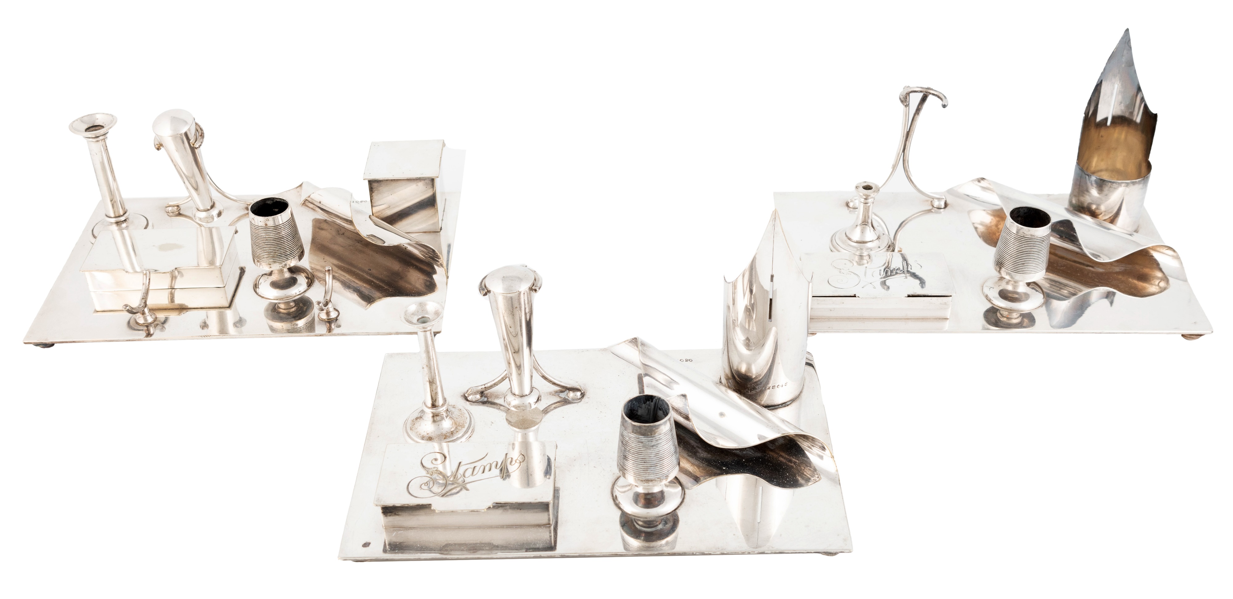 rectangular form, the inkwells modelled as a pen nibs and one of cube form, a stamp box, the hinged cover two inscribed 'Stamps', a vesta holder, two with desk seals and a taper sticks, on a rectangular bases, with a curled page motif, on four bun feet, length 18.8cm. (3)