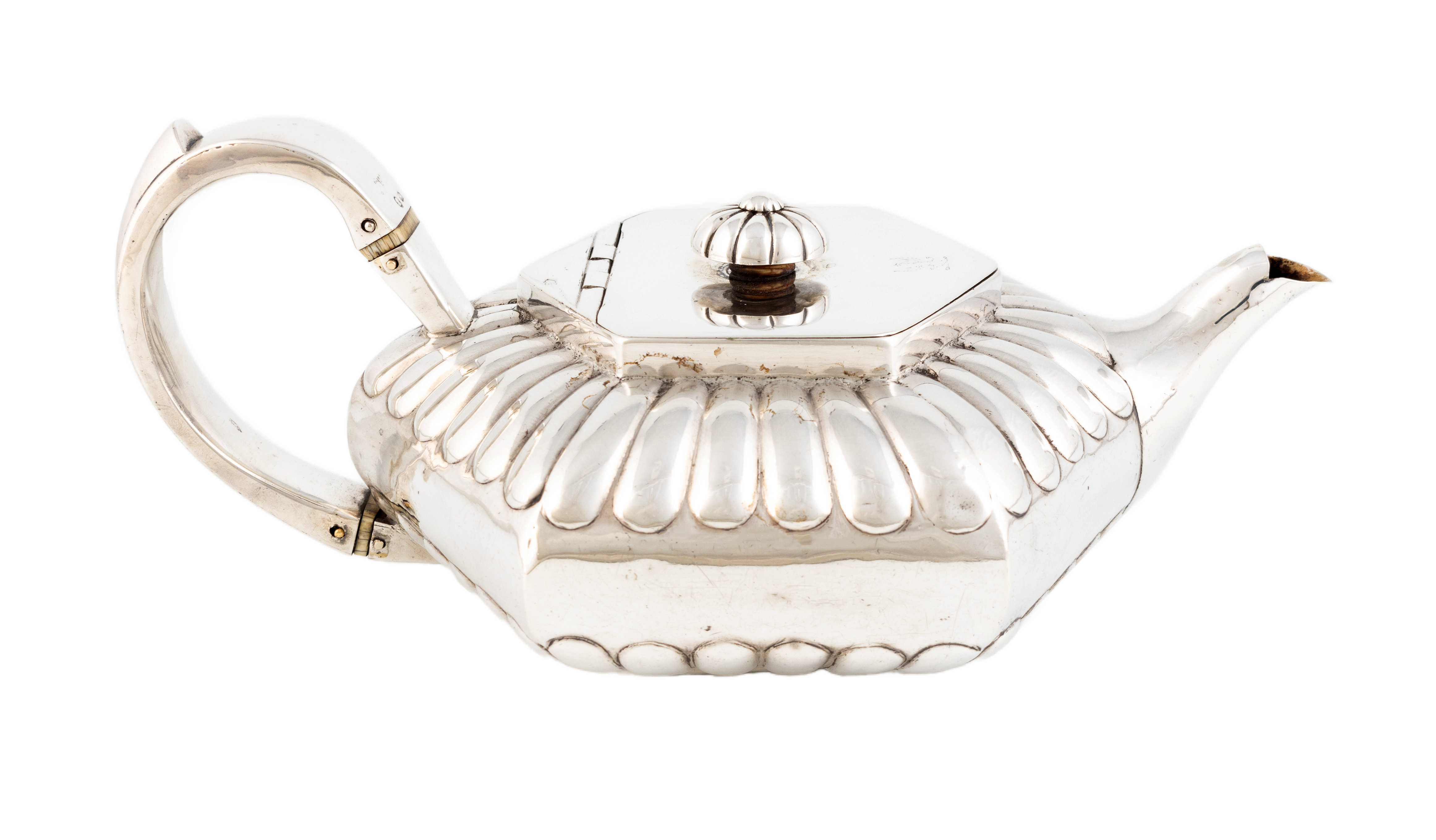 hexagonal form with fluted decoration, the hinged cover engraved with a crest, scroll handle with ivory insulators, length handle to spout 26.4cm, approx. weight 21.8oz.