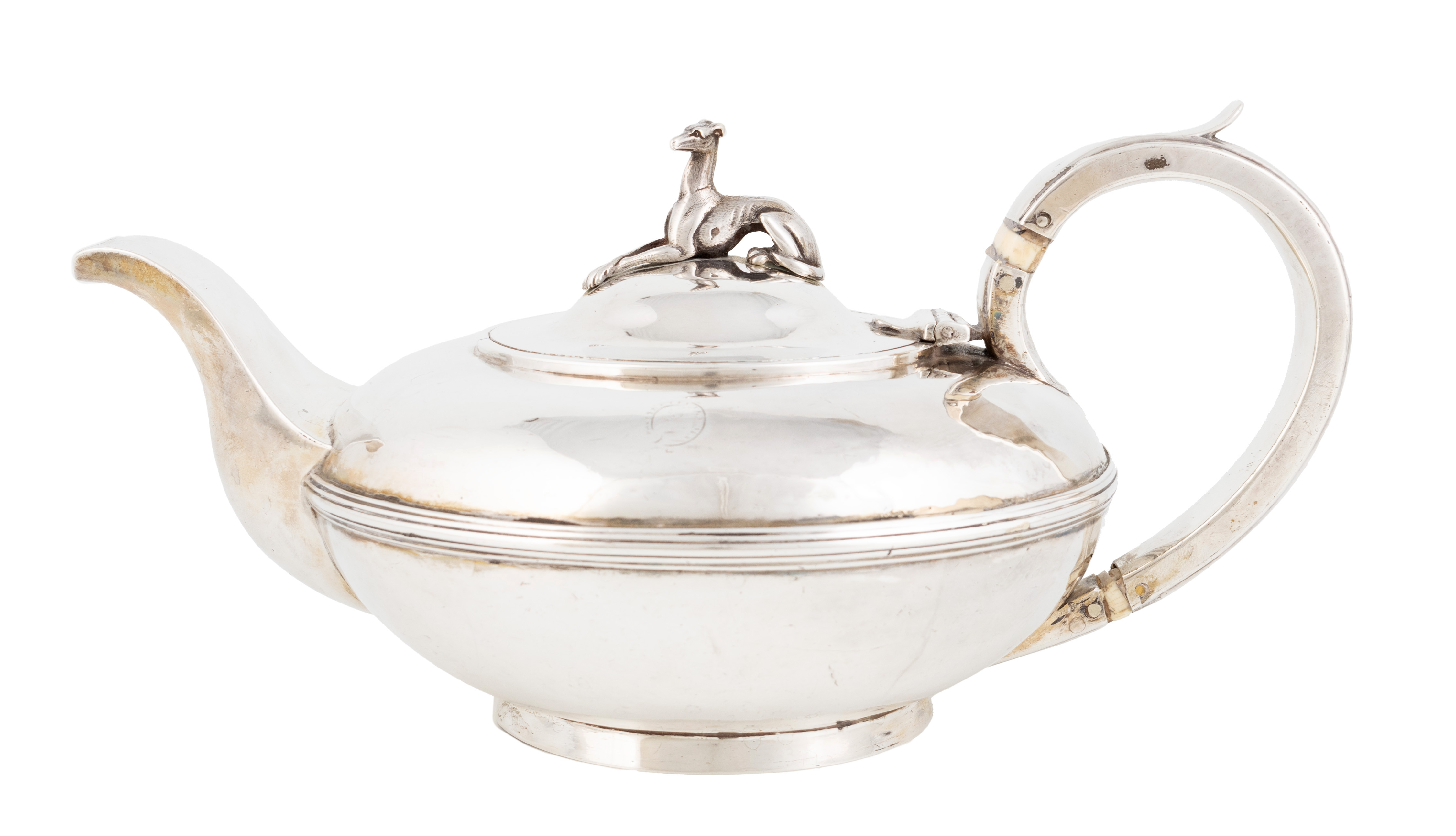 compressed circular form, the scroll handle with ivory insulators, the hinged cover with a recumbent greyhound, length 25.7cm, approx. weight 19.8oz.