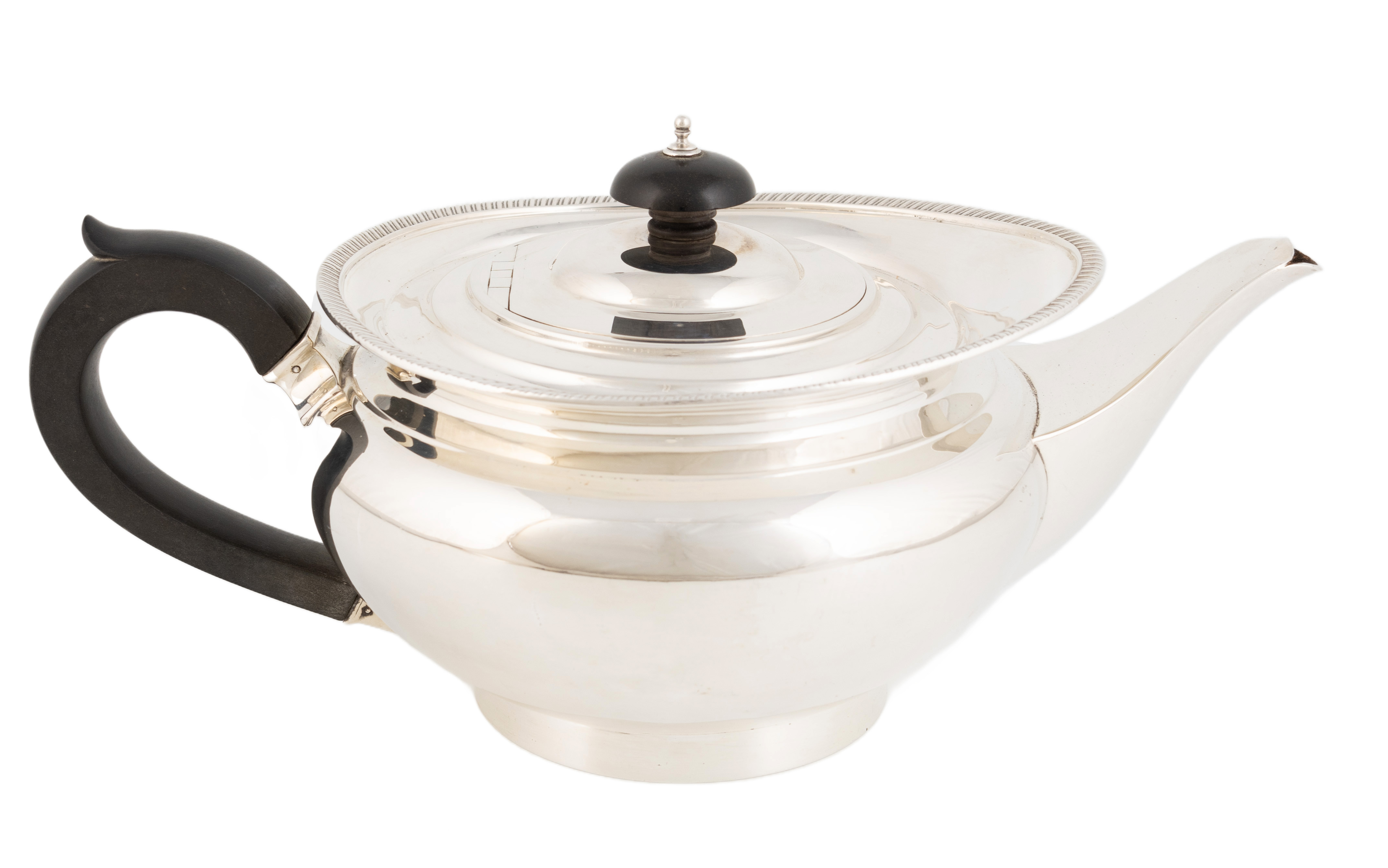 circular bellied form with a gadrooned border, length handle to spout 26.2cm, approx. weight 17.6oz.