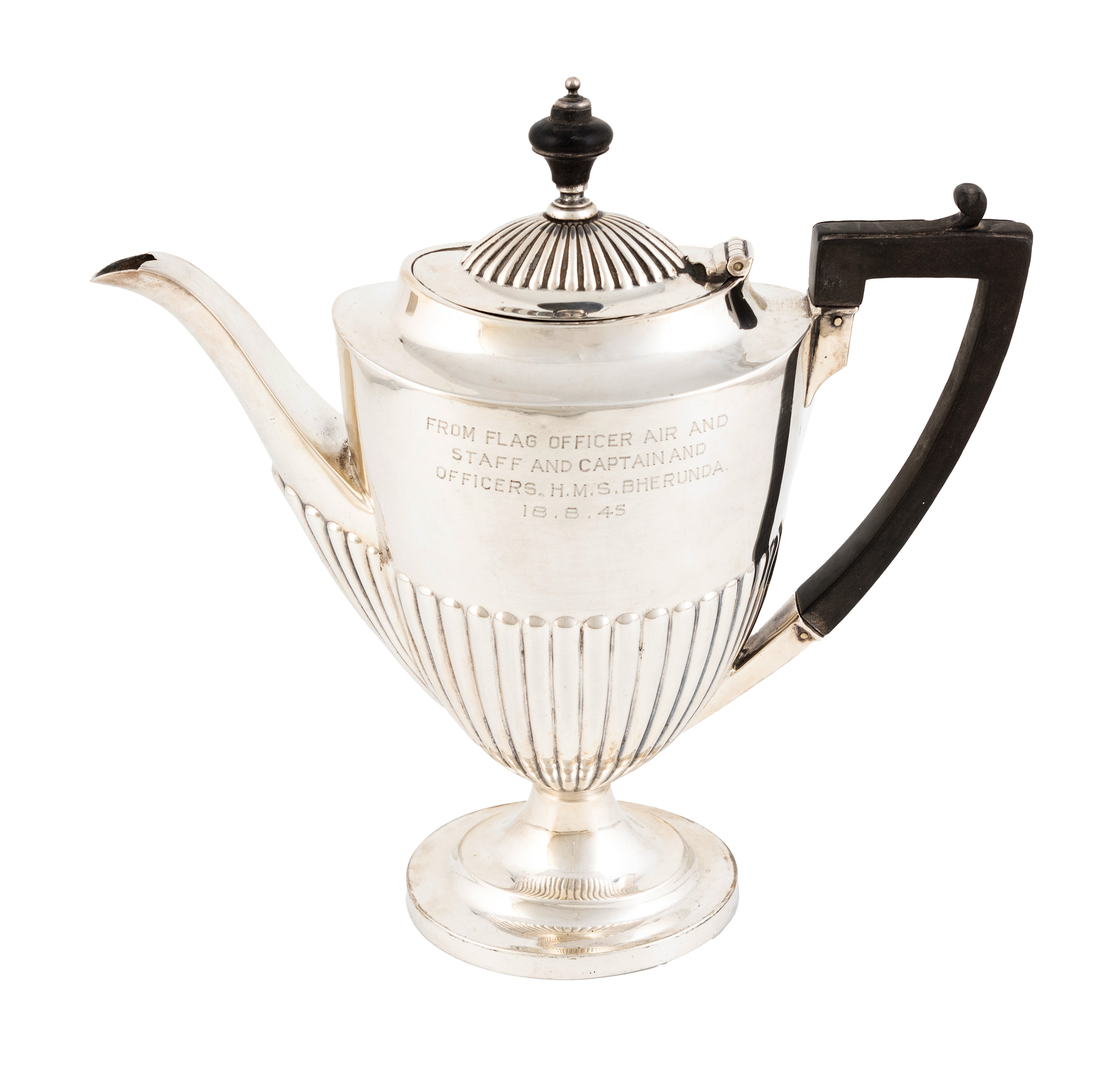 urn form with part-fluted decoration, hinged cover with a wooden knop finial, on an oval foot, inscribed, height 24.5cm, approx. weight 17.1oz.