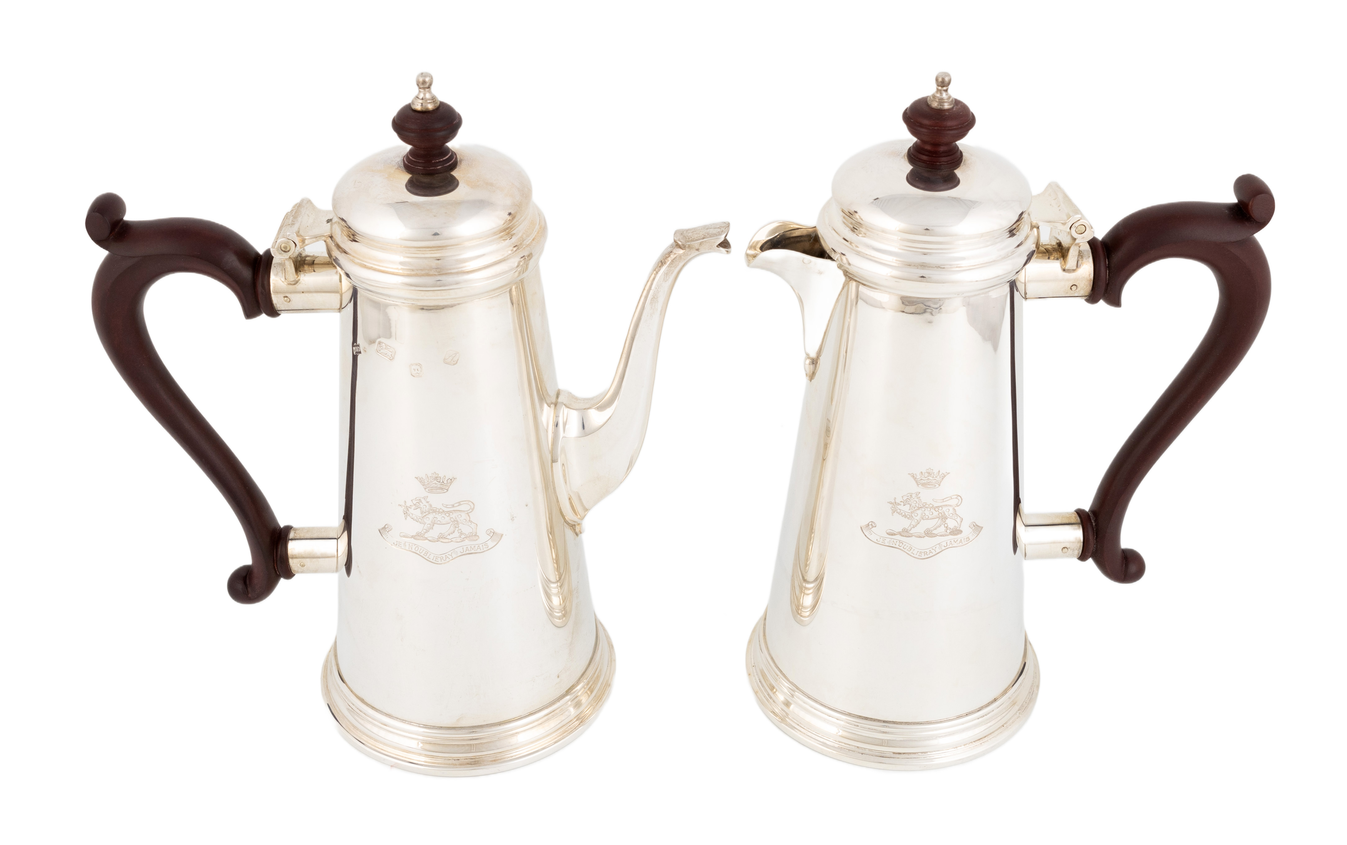tapering circular form, engraved with a crowned crest and motto, scroll wooden handles, height 22.4cm, total approx. weight 31.6oz. (2)